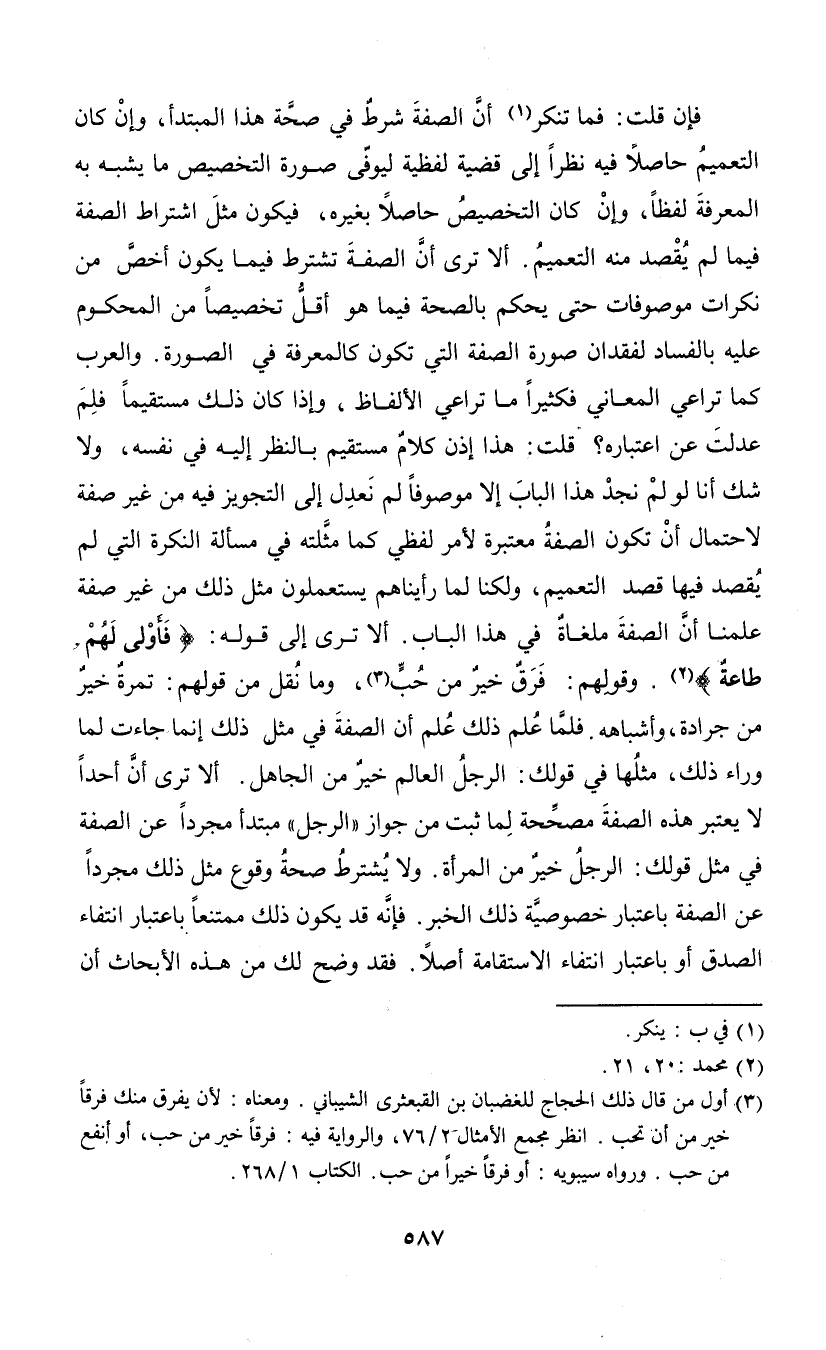 فإن قلت: فما تنكر (¬1) أن الصفة شرط في صحة هذا المبتدأ، وإن كان التعميم حاصلا فيه نظرا إلى قضية لفظية ليرفى صورة التخصيص ما يشبه به المعرفة لفظا، وإن كان التخصيص حاصلا بغيره، فيكون مثل اشتراط الصفة فيما لم يقصد منه التعميم. ألا ترى أن الصفة تشترط فيما يكون أخص من نكرات موصوفات حتى يحكم بالصحة فيما هو أقل تخصيصا من المحكوم عليه بالفساد لفقدان صورة الصفة التي تكون كالمعرفة في الصورة. والعرب كما تراعي المعاني فكثيرا ما تراعي الألفاظ، وإذا كان ذلك مستقيما فلم عدلت عن اعتباره؟ قلت: هذا إذن كلام مستقيم بالنظر إليه في نفسه، ولا شك أنا لو لم نجد هذا الباب إلا موصوفا لم نعدل إلى التجويز فيه من غير صفة لاحتمال أن تكون الصفة معتبرة لأمر لفظي كما مثلته في مسألة النكرة التي لم يقصد فيها قصد التعميم، ولكنا لما رأيناهم يستعملون مثل ذلك من غير صفة علمنا أن الصفة ملغاة في هذا الباب. ألا ترى إلى قوله: {فأولى لهم طاعة} (¬2). وقولهم: فرق خير من حب (¬3)، وما نقل من قولهم: تمرة خير من جرادة، وأشباهه. فلما علم ذلك علم أن الصفة في مثل ذلك إنما جاءت لما وراء ذلك، مثلها في قولك: الرجل العالم خير من الجاهل. ألا ترى أن أحدا لا يعتبر هذه الصفة مصححة لما ثبت من جواز "الرجل" مبتدأ مجردا عن الصفة في مثل قولك: الرجل خير من المرأة. ولا يشترط صحة وقوع مثل ذلك مجردا عن الصفة باعتبار خصوصية ذلك الخبر. فإنه قد يكون ذلك ممتنعا باعتبار انتفاء الصدق أو باعتبار انتفاء الاستقامة أصلا. فقد وضح لك من هذه الأبحاث أن