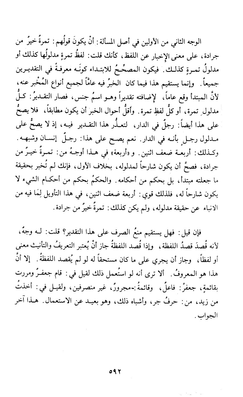 الوجه الثاني من الأولين في أصل المسألة: أن يكون قولهم: تمرة خير من جرادة، على معنى الإخبار عن اللفظ، كأنك قلت: لفظ تمرة مدلولها كذلك أو مدلول تمرة كذلك. فيكون المصحح للابتداء كونه معرفة في التقديرين جميعا. وإنما يستقيم هذا فيما كان الخبر فيه عاما لجميع أنواع المخبر عنه، لأن المبتدأ وقع عاما، لإضافته تقديرا وهو اسم جنس، فصار التقدير: كل مدلول تمرة، أو كل لفظ تمرة. وأقل أحوال الخبر أن يكون مطابقا، فلا يصح على هذا أيضا: رجل في الدار، لتعذر هذا التقدير فيه إذ لا يصح على مدلول رجل بأنه في الدار. نعم يصح على هذا: رجل إنسان وشبهه. وكذلك: أربعة ضعف اثنين. و" أربعة" في هذا أوجه من: تمرة خير من جرادة، فصح أن يكون شارحا لمدلوله، بخلاف الأول، فإنك لم تخبر بحقيقة ما جعلته مبتدأ، بل بحكم من أحكامه. والحكم بحكم من أحكام الشيء لا يكون شارحا له، فلذلك قوي: أربعة ضعف اثنين، في هذا التأويل لما فيه من الانباء عن حقيقة مدلوله، ولم يكن كذلك: تمرة خير من حرادة. فإن قيل: فهل يستقيم منع الصرف على هذا التقدير؟ قلت: له وجه، لأنه قصد قصد اللفظة، وإذا قصد اللفظة جاز أن يعتبر التعريف والتأنيث معنى أو لفظا، وجاز أن يجري على ما كان مستحقا له لو لم يقصد اللفظة: إلا أن هذا هو المعروف. ألا ترى أنه لو استعمل ذلك لقيل في: قام جعفر ومررت بقائمة، جعفر: فاعل، وقائمة: ـ مجرور، غير منصرفين، ولقيل في: أخذت من زيد، من: حرف جر، وأشباه ذلك، وهو بعيد عن الاستعمال. هذا اخر الجواب.