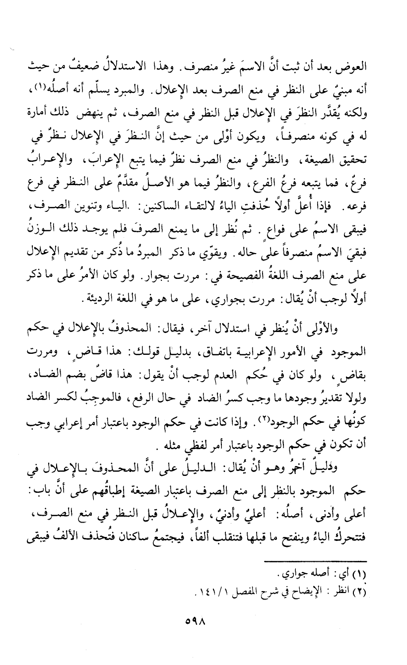 العوض بعد أن ثبت أن الاسم غير منصوف. وهذا الاستدلال ضعيف من حيث أنه مبني على النظر في منع الصرف بعد الإعلال. والمبرد يسلم أنه أصله (¬1)، ولكنه يقدر النظر في الإعلال قبل النظر في منع الصرف، ثم ينهض ذ ... لك أمارة له في كونه منصرفا، ويكون أولى منحيق إن النظر في الإعلال نظر في تحقيق الصيغة، والنظر في منع الصرف نظر فيما يتبع الإعراب، والإعراب فرع، فما يتبعه فرع الفرع، والنظر فيما هو الأصل مقدم على النظر في فرع فرعه. فإذا أعل أولا حذفت الياء لالتقاء الساكنين: الياء وتنوين الصرف، فيبقى الاسم على فواع. ثم نظر إلى ما يمنع الصرف فلم يوجد ذلك الوزن فبقي الاسم منصرفا على حاله. ويقوي ما ذكر المبرد ما ذكر من تقديم الإعلال على منع الصرف اللغة الفصيحة في: مررت بجوار. ولو كان الأمر على ما ذكر أولا لوجب أن يقال: مررت بجواري، على ما هو في اللغة الرديئة.