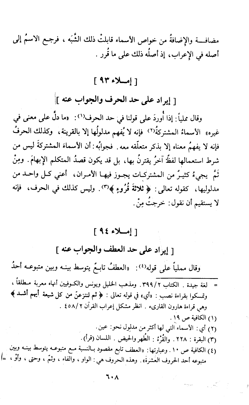(¬4) الكافية ص10. وعبارتها: " العطف تابع مقصود بالنسبة مع متبوعه يتوسط بينه وبين متبوعه أحد الحروف العشرة". وهذه الحروف هي: الواو، والفاء، وثم، وحتى، وأو، وأم، ويل، ولكن، ولا، وليس.