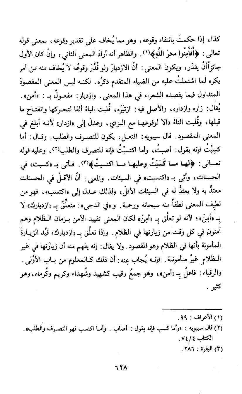 كذا، إذا حكمت بانتفاء وقوعه، وهو مما يخاف على تقدير وقوعه، بمعنى قوله تعالى: {أفأمنوا مكر الله} (¬1). والظاهر أنه أراد المعنى الثاني، وإن كان الأول جائزا أن يقدر، ويكون المعنى: أن الازديار ولو قدر وقوعه لا يخاف منه من أمر يكره لما اشتملت عليه من الضياء المتقدم ذكره. لكنه ليس المعنى المقصود المتداول فيما ييقصده الشعراء في هذا المعنى. وازديار: مقعول بـ: " أمن". يقال: زاره وازداره، والأصل فيه: ازتيره، قلبت الياء ألفا لتحركها وانفتاح ما قبلها، وقلبت التاء دالا لوقوعها مع الراي، وعدل إلى " ازدار" لأنه أبلغ في المعنى المقصود. قال سيبويه: افتعل، يكون للتصرف والطلب. وقال: أما كسبت فإنه يقول: أصبت، وأما اكتسبت فإنه للتصرف والطلب (¬2)، وعليه قوله تعالى: {لها ما كسبت وعليها ما اكتسبت} (¬3). فأتى بـ " كسبت" في الحسنات، وأتى بـ " اكتسبت" ي السيئات. والمعنى: أن الأتل في الحسنات معتد به ولا يعتد له في السيئات الأقل، ولذلك عدل إلى " اكتسب"، فهو من لطيف المعنى لطفا منه سبحانه ورحمة. و " في الدجى": متعلق بـ " ازديارك" لا بـ " أمن"؛ لأنه لو تعلق بـ " أمن" لكان المعنى بقييد الأمن بزمان الظلام وهم آمنون في كل وقت من زيارتها في الظلام. وإذا تعلق بـ " ازديارك" قيد الزيارة المأمونة بأنها في الظلام وهو المقصود. ولا يقال: إنه يفهم منه أن زيارتها في غير الظلام غير مأمونة. فإنه يجاب عنه: أن ذلك كالمعلوم من باب الأولى. والرقباء: قاعل بـ " أمن"، وهو جمع رقيب كشهيد وشهداء وكريم وكرماء، هو كثير.