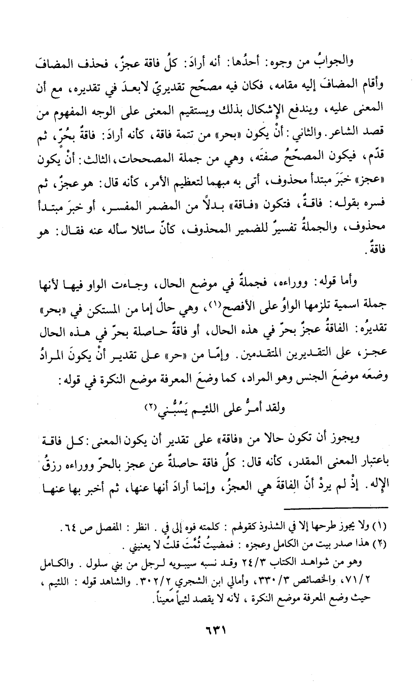 والجواب من وجوه: أحدها: أنه أراد: كل فاقة عجز، فحذف المضاف وأقام المضاف إليه مقامه، فكان فيه مصحح تقديري لا بعد في تقديره، مع أن المعنى عليه، ويندفع الإشطال بذلك ويستقيم المعنى على الوجه المفهوم من قصد الشاعر. والثاني: أن يكون " بحر" من تتمة فاقة، كأنه أراد: فاقة بحر، ثم قدم، فيكون المصحح صفته، وهي من جملة المصححات، الثالث: أن يكون " عجز" خبر مبتدأ محذوف، أتى به مبهما لتعظيم الأمر، كأنه قال: هو عجز، ثم فسره بقوله: فاقة، فتكون " فاقة" بدلا من المضمر المفسر، أو خبر مبتدأ محذوف، والجملة تفسير للضمير المحذوف، كأن سائلا سأله عنه فقال: هو فاقة. وأما قوله: ووراءه، فجملة في موضع الحال، وجاءت الواو فيها لأنها جملة اسمية تلزمها الواو على الأفصح (¬1)، وهي حال إما من المستكن في "بحر" بقديره: الفاقة عجز بحر في هذه الحال، أو فاقة حاصلة بحر في هذه الحال عجز، على التقديرين المتقدمين. وإما من " حر" على تقديى أن يكون المراد وضعه موضع الجنس وهو المراد، كما وضع المعرفة موضع النكرة في قوله: