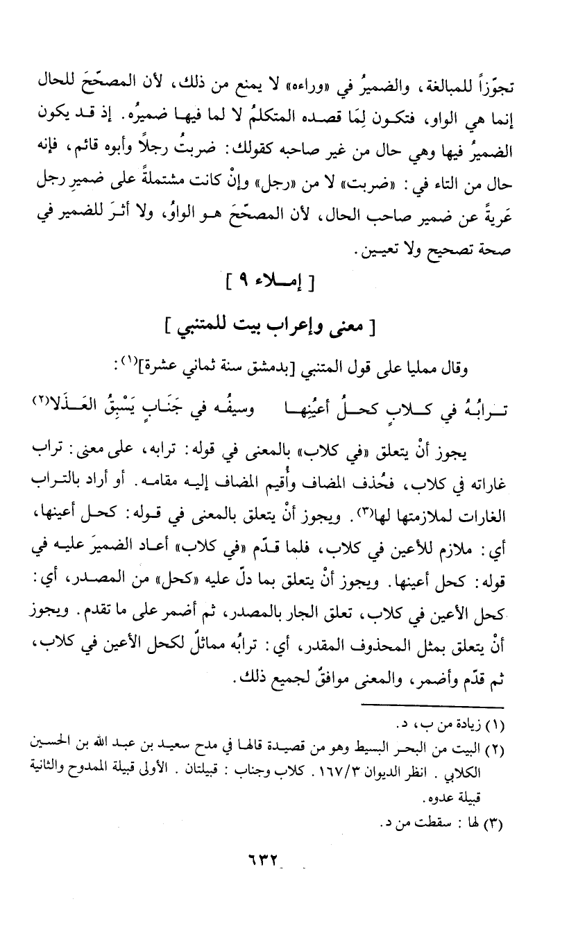 (¬2) البيت من البحر البسيط وهو من قصيدة قالها في مدح سعيد بن عبد الله بن الحسين الكلابي. انظر الديوان 3/ 167. كلاب وجناب: قبيلتان. الأولى قبيلة الممدوح والثانية قبيلة عدوه.
