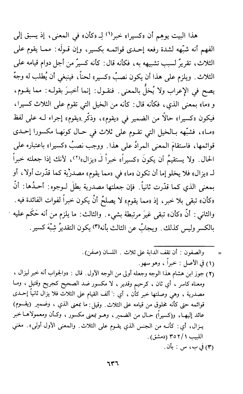 (¬2) جوز ابن هشام هذا الوجه وجعله أولى من الوجه الأول. قال: " والجواب أنه خبر ليزال، ومعنا كاسر، أي ثان، كرحيم وقدير، لا مكسور ضد الصحيح كجريح وقتيل، وما مصدرية، وهي، وهي وصلتها خبر كأن، أي: ألف القيام على الثلاث فلا يزال ثانيا إحدى قوائمه حتى كأنه مخلوق من قيامه على الثلاث. وقيل: ما بمعنى الذي، وضمير (يقوم) عائد إليها، و (كسيرا) حال من الضمير، وهو بمعنى مكسور، وكأن ومعمولاها خبر يزال، أي: كأنه من الجنس الذي يقوم على الثلاث. والمعنى الأول أولى". مغني اللبيب 1/ 352 (دمشق).