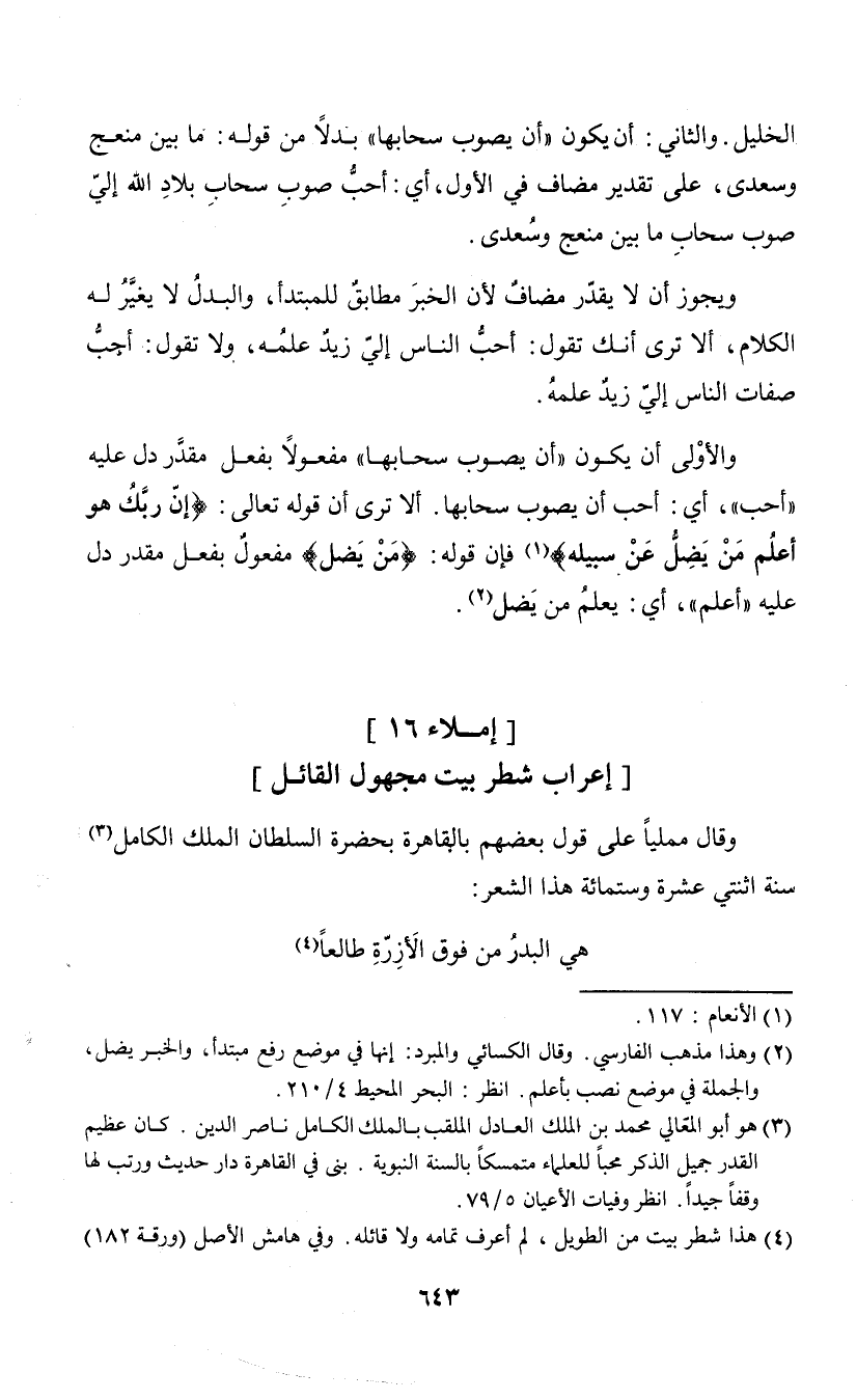 (¬3) هو أبوالمعالي محمد بن الملك العادل الملقب بالملك الكامل ناصر الدين. كان عظيم القدر جميل الذكر محبا للعلماء متمسكا بالسنة النبوية. بنى في القاهرة دار حديث ورتب لها وقفا جيدا. انظر وفيات الأعيان5/ 79.
