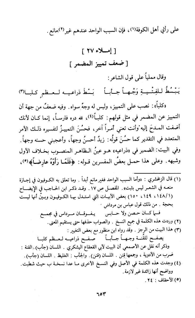 (¬1) قال الزمخشري: "وأما السبب الواحد فغير مانع أبدا. وما تعلق به الكوفيون في إجازة منعه في الشعر ليس بثبت". المفصل ص17. وقد ذكر ابن الحاجب في الإيضاح (1/ 148، 149، 150) بعض الأبيات التي استدل بها الكوفيون وبين أنها ليست بحجة. من ذلك قول عباس بن مرداش