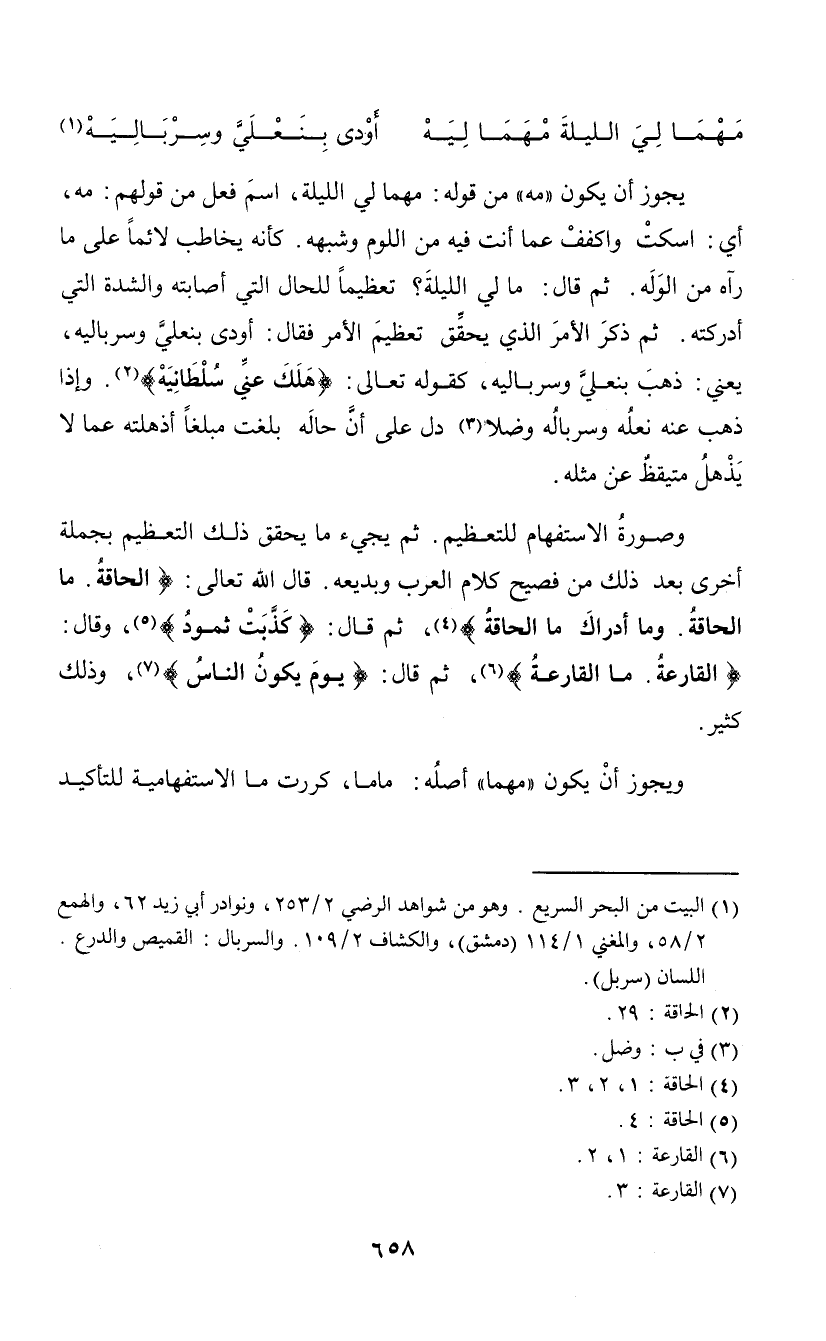 يجوز أن يكون "مه" من قوله: مهما لي الليلة، اسم فعل من قولهم: مه، أي: اسكت واكفف عما أنت فيه من اللوم وشبهه. كأنه يخاطب لائما على ما رآه من الوله. ثم قال: ما لي الليلة؟ تعظيما للحال التي أصابته والشدة التي أدركته. ثم ذكر الأمر الذي يحقق تعظيم الأمر فقال: أودى بنعلي وسر باليه، يعني: ذهب بنعلي وسرباليه، كقوله تعالى: {هلك عني سلطانيه} (¬2). وإذا ذهب عنه نعله وسرباله وضلا (¬3) دل على أن حاله بلغت مبلغا أذهلته عما لا يذهل متيقظ عن مثله. وصورة الاستفهام للتعظيم. ثم يجيء ما يحقق ذلك التعظيم بجملة أخرى بعد ذلك من فصيح كلام العرب وبديعه. قال لله تعالى: {الحاقة. ما الحاقة. ما أدراك ما الحاقة} (¬4)، ثم قال: {كذبت ثمود} (¬5)، وقال: {القارعة. ما القارعة} (¬6)، ثم قال: {يوم يكون الناس} (¬7)، ذلك كثير ويجوز أن يكون "مهما" أصله: ماما، كررت ما الاستفهامية للتأكيد