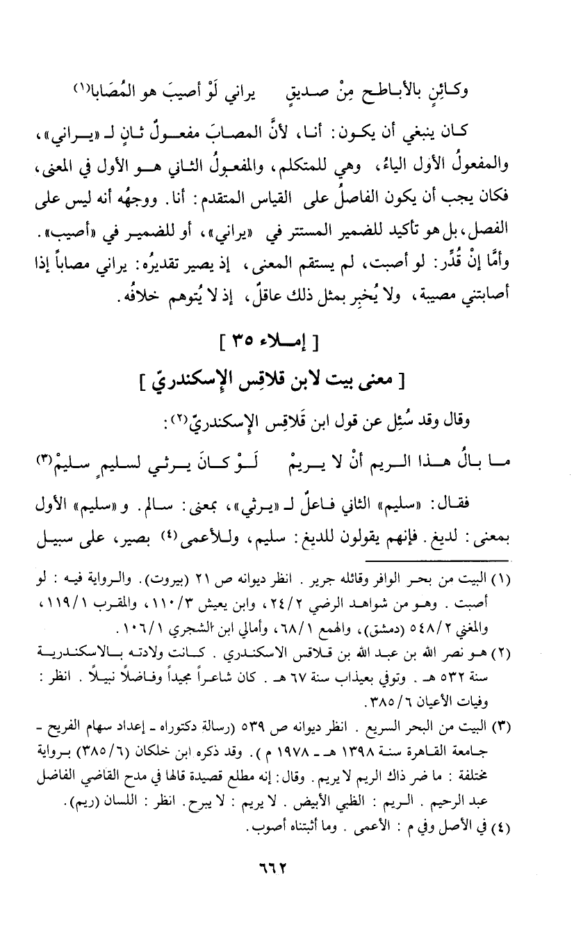 فقال: "سليم" الثاين فاعل لـ "يرثي"، بمعنى: سالم. و" سليم" الأول بمعنى: لديغ. فإنهم يقولون للديغ": سليم، وللأعمى (¬4) بصير، على سبيل