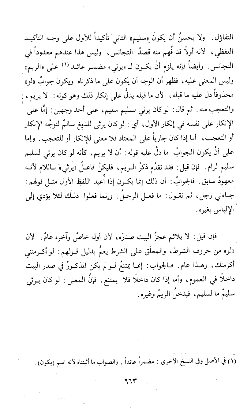 التفاؤل. ولا يحسن أن يكون "سليم" الثاني تأكيدا للأول على وجه التأكيد اللفظي، لأنه أولا قد فهم منه قصد التجانس، وليس هذا عندهم معدودا في التجانس. وأيضا فأنه يلزم أن يكون لـ " يرثي" مضمر عائد (¬1) على " الريم"وليس المعنى عليه، فظهر أن الوجه أن يكون على ما ذكرناه ويكون جواب " لو" محذوفا دل عليه ما قبله، لأن ما قبله يدل على إنكار ذلك وهو كونه: لايريم، والتعجب منه. ثم قال: لوكان يرثي لسليم سليم، على أحد وجهين: إما على الإنكار على نفسه في إنكار الأول، أي: لو كان يرثى للديغ سالم لتوجه الإنكار أو التعجب، أما إذا كان جاريا على المعتاد فلا معنى للإنكار أو للتعجب. وإما على أن يكون الجواب ما دل عليه قوله: أن لا يريم، كأنه لو كان يرثي لسليم سليم لرام. فإن قيل: فقد تقدم ذكر الريم، فليكن فاعل "يرثي" باللام لأنه معهود سابق. فالجواب: أن ذلك إنما يكون إذا أعيد اللفظ الأول مثل قولهم: جاءني رجل، ثم تقول: ما فعل الرجل. وإنما فعلوا ذلك لئلا يؤدي إلى الإلباي بغيره. فإن قيل: لا يلائم عجز البيت صدره، لأن اوله خاص وآخره عام، لأن "لو" من حروف الشرط، والمعلق على الشرط يعم بدليل قولهم: لو أكلامتني أكرمتك، وهذا عام. فالجواب: إنما يمتنع لو لم يكن المذكور في صدر البيت داخلا في العموم، وأما إذا كان داخلا فلا يمتنع، فإن المعنى: لو كان يرثي سليم ما لسليم، فيدخل الريم وعيره.