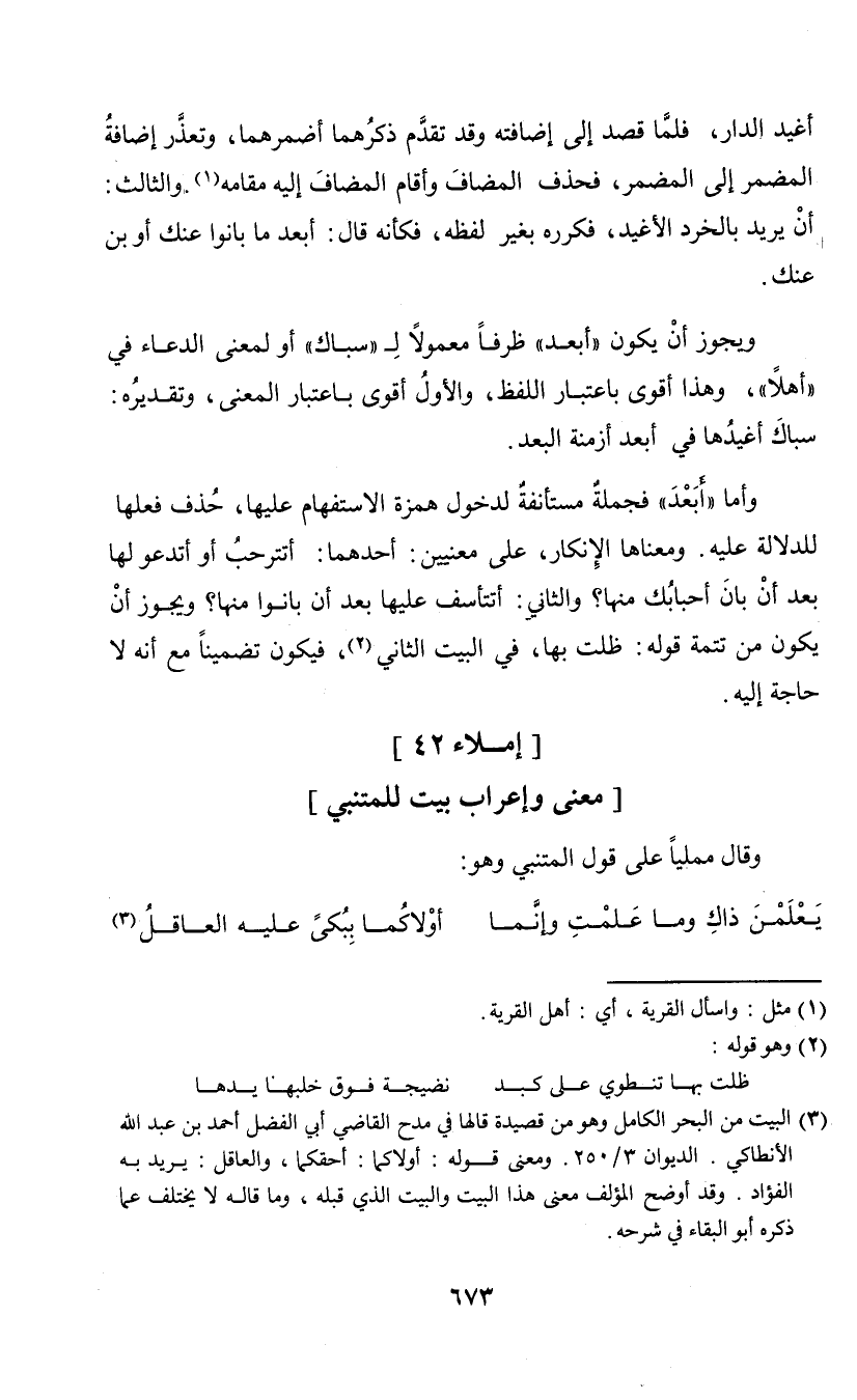 (¬3) البيت من البحر الكامل وهو من قصيدة قالها في مدح القاضي أبي الفضل أحمد ين عبدالله الأنطاكي. الديوان 3/ 250. ومعنى قوله: أولاكما: أحكما، والعاقل: يريد به الفؤاد. وقد أوضح المؤلف معنى هذا البيت والبيت الذي قبله، وما قاله لا يختلف عما ذكره أبو البقاء في شرحه.