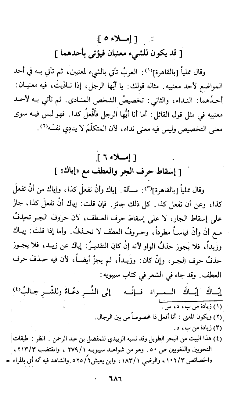 (¬4) هذا البيت من البحر الطويل وقذ يسبه الزبيدي للمفضل بن عبد الرحمن. انظر: طبقات النحويين واللعويين ص50. وهو من شواهد سيبويه 1/ 279، والمقتضب 3/ 213، والخصائص3/ 102، والرضي1/ 183، وابن يعيش2/ 525. والشاهد فيه أنه أتى بالمراء وهو مفعول به بعد إياك بغير حرف عطف. قال ابن الحاجب في الإيضاح: " وحمله ابن أبي إسحق على أن أصله إياك من المراء، فحذف حرف الجر لما كان المراء بمعنى أن تماري، فحمله عليه من حيث المعنى على شذوذه"1/ 360.