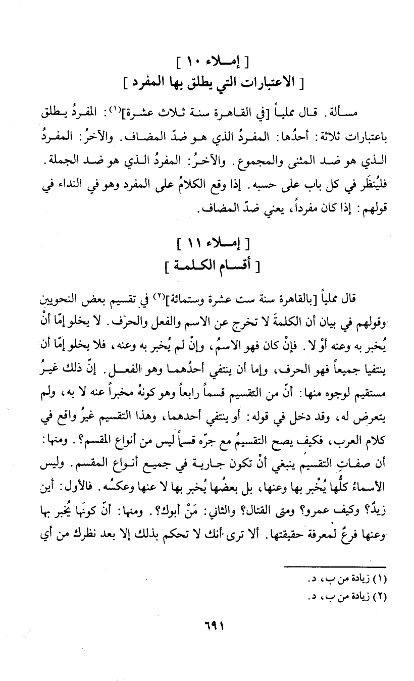 مسألة. قال ممليا [في القاهرة سنة ثلاث عشرة] (¬1): المفرد يطلق باعتبارات ثلاثة: أحدها: المفرد الذي هو ضد المضاف. والآخر: المفرد الذي هو ضد المثنى والمجموع. والآخر: المفرد الذي هو ضد الجملة. فلينظر في كل باب على حسبه. إذا وقع الكلام على المفرد وهو في النداء في قولهم: إذا كان مفردا، يعني ضد المضاف.