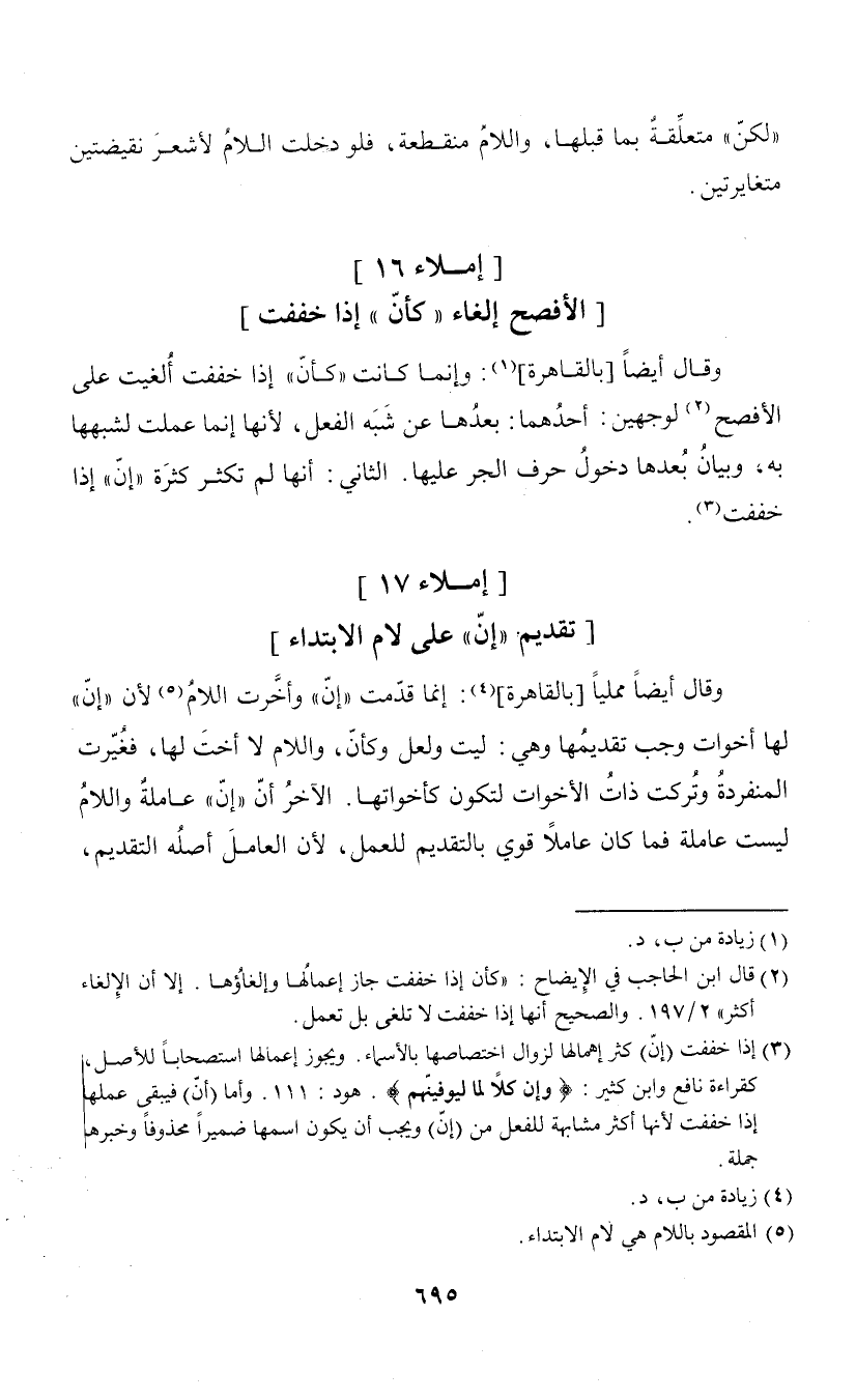(¬2) قال ابن الحاجب في الإيضاح: " كأن إذا خففت جاز إعمالها وإلغاؤها. إلا أن الإلغاء أكثر"2/ 197. والصحيح أنها إذا خففت لا تلغى بل تعمل.