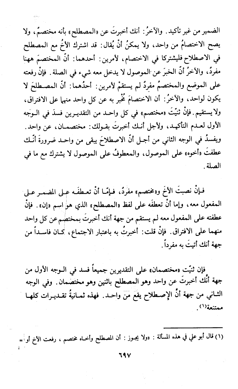 الصمير من غير تأكيد. والآخر: أنك أخبرت عن " المصطح" بأنه مختصم، ولا يصح الاختصام من واحد، ولا يمكن أن يقال: قد اشترك الأخ مع المصطلح في الا صطلاح فليشتركا في الاختصام، لأمرين: أحدهما: أن المختصم ههنا مفرد، والآخر أن الخبر عن الموصول لا يدخل معه شيء في الصلة. فإن رفعته على الموضع والمختصم مفرد لم يستقم لأمرين: أحدهما: أن المصطلح لا يكون لواحد، والآخر: أن الاختصام مخبر به عن كل واحد منهما على الافتراق، ولا يستقيم. فإن ثنيت "مختصم" في كل واحد من التقديرين فسد في الوجه الأول لعدم التأكيد، ولأجل أنك أخبرت بقولك: مختصمان، عن واحد. ويفسد في الوجه الثاني من أجل أن الاصطلاح يبقى من واحد ضرورة أنك عطفت "أخوه" على الموصول، المعطوف على الموصول لا يشترك مع ما في الصلة. فإن نصبت الأخ و"مختصم" مفرد، فإما أن تعطفه على المضمر على المفعول معه، وإما أن تعطفه على لفظ " المصطلح" الذي هو اسم "إن" فإن عطفته على المفعول معه لم يستقم من جهة أنك أخبرت بمختصم عن كل واحد منهما على الافتراق. فإن قلت: أخبرت به باعتبار الاجتماع، كان فاسدا من جهة أنك أتيت به مفردا. فإن ثنيت "مختصمان" على التقديرين جميعا فسد في الوجه الأول من جهة أنك أخبرت عن واحد وهو المصطلح باثنين وهو مختصمان. وفي الوجه الثاني من جهة أن الإصطلاح يقع من واحد. فهذه ثمانية تقديرات كلها ممتنعة (¬1).