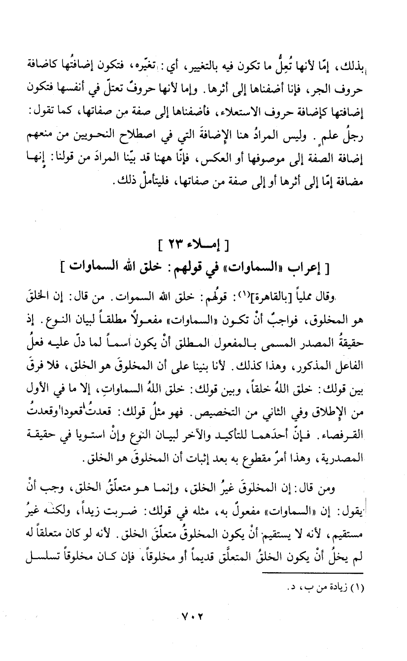 وقال ممليا [بالقاهرة] (¬1): قولم: خلق الله السموات. من قال: إن الخلق هو المخلوق، فواجب أن تكون " السماوات" مفعولا مطلقا لبيان النوع. إذ حقيقة المصدر المسمى بالمفعول المطلق أن يكون اسما لما دل عليه فعل الفاعل المذكور، وهذا كذلك. لأنا بنينا على أن المخلوق هو الخلق، فلا فرق بين قولك: خلق الله خلقا، وبين قولك: خلق الله السماوات، إلا ما في الأول من قولك: خلق الله خلقا، وبين قولك: خلق الله السماوات، وإلا ما في الأول من الإطلاق وفي الثاني من التخصيص. فهو مثل قولك: قعدت قعودا وقعدت القرفصاء. فإن أحدهما للتأكيد والآخر لبيان النوع وإن استويا في حقيقة المصدرية، وهذا أمر مقطوع به بعد إثبات أن المخلوق هو الخلق. ومن قال: إن المخلوق غير الخلق، وإنما هو متعلق الخلق، وجب أن يقول: إن "السماوات: مفعول به، مثله في قولك: ضربت زيدا، ولكنه غير مستقيم، لأنه لا يستقيم أن يكون المخلوق متعلق الخلق. لأنه لو كان متعلقا له لم يخل أن يكون الخلق المتعلق قديما أو مخلوقا، فإن كان مخلوقا تسلسل