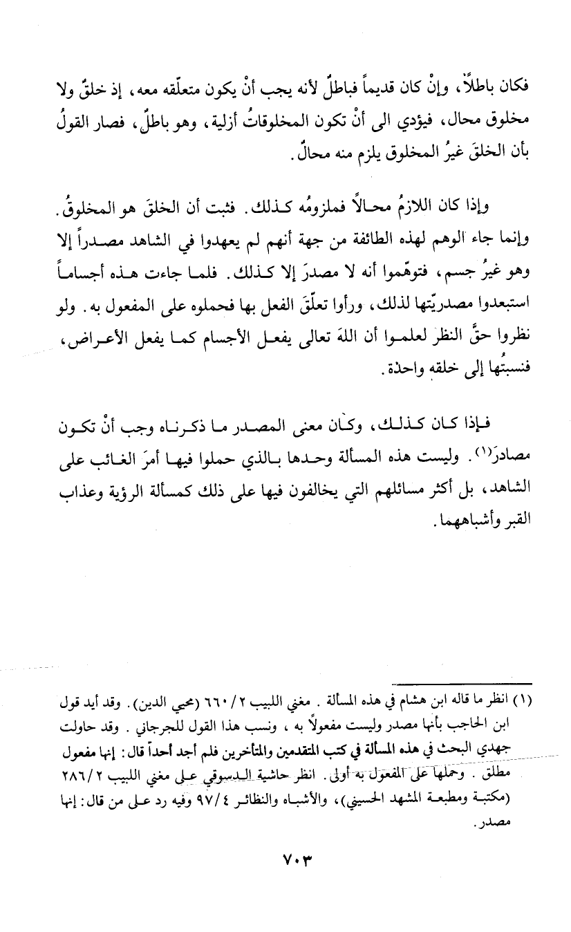 فكان باطلا، وإن كان قديما فباطل لأنه يجب أن يكون متعلقه معه، وإذ خلق ولا مخلوق محال، فؤدي إلى أن تكون المخلوقات أزلية، وهو باطل، فصار القول بأن الخلق غير المخلوق يلزم منه محال. وإذا كان اللازم محالا فملزومه كذلك. فثبت أن الخلق هو المخلوق. وإنما جاء الوهم لهذه الطائفة من جهة أنهم لم يعهدوا في الشاهد مصدرا إلا وهو غير جسم، فتوهموا أنه لا مصدر إلا كذلك. فلما جاءت هذه أجساما استبعدوا مصدريتها لذلك، ورأوا تعلق الفعل بها فحملوه على المفعول به. ولو نظروا حق النظر لعلموا أن الله تعالى يفعل الأجسام كما يفعل الأعراض، فنسبتها إلى خلقه واحدة. فإذا كان كذلك، وكان معنى المصدر ما ذكرناه وجب أن تكون مصادر (¬1). وليست هذه المسألة وحدها بالذي حملوا فيها أمر الغائب على الشاهد، بل أكثر مسائلهم التي يخالفون فيها على ذلك كمسألة الرؤية وعذاب القبر وأشباههما.