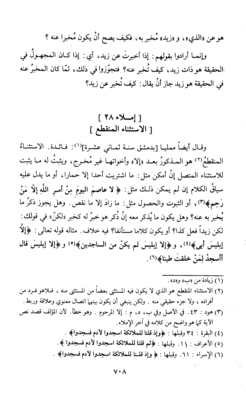 وقال أيضا ممليا [بدمشق سنة ثماني عشرة] (¬1): فائدة. الاستثناء المنقطع (¬2) وهو المذكور بعد " إلا" وأخواتها غير مخرج، ويثبت له ما يثبت للاستثناء المتصل إن أمكن مثل: ما اشتريت أحدا إلا حمارا، أو ما يدل عليه سياق الكلام إن لم يمكن ذلك مثل: {لا عاصم اليوم من أمر الله إ لا من رحم} (¬3)، أو الثبوت والحصول مثل: ما زاد إلا ما نقص. وهل يجوز ذكر ما يحبر به عنه؟ وهل يكون ما يذكر معه إن ذكر هو خبر له كخبر " لكن" في قولك: لكن زيدا فعل كذا؟ أو يكون كلاما مستأنفا؟ فيه خلاف. مثاله قوله تعالى: {إلا إبليس أبي} (¬4)، و {إلا إبليس لم يكن من الساجدين} (¬5) و {إلا إبليس قال أأسجد لمن خلقت طينا} (¬6).