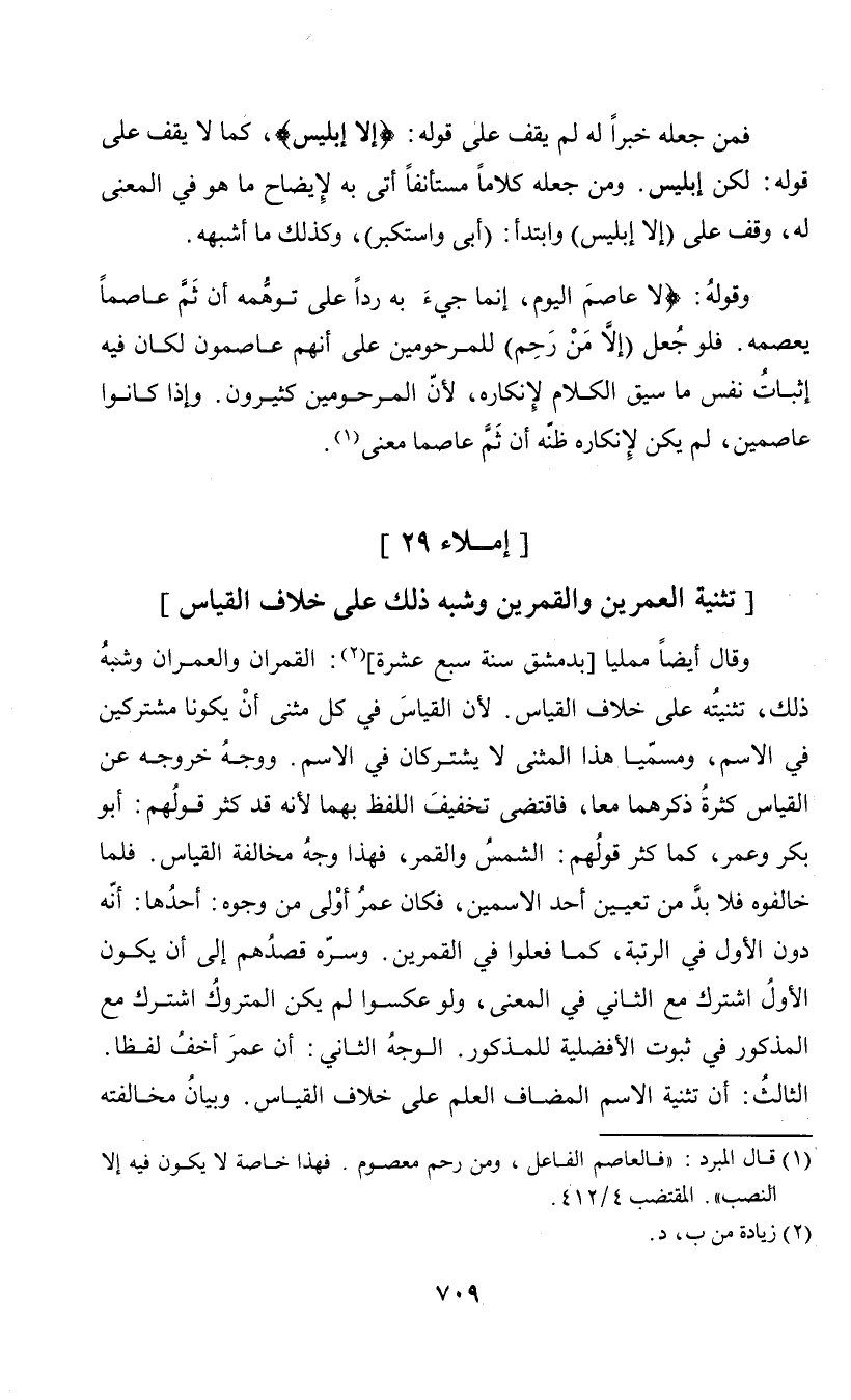 وقال أيضا ممليا [بدمشق سنة سبع عشرة] (¬2): القمران والعمران وشبه ذلك، تثنيته على خلاف القياس. لأن القياس في كل مثنى أن يكونا كشتركين في الاسم، ومسميا هذا المثنى لا يشتركان في الاسم. ووجه خروجه عن القياس كثرة ذكرهما معا، فاقتضى تخفيف اللفظ بهما لأنه قد كثر قولهم: أبو بكر وعمر، كما كثر قولهم: الشمس والقمر، فهذا وجه مخالفة القياس. فلما خالفوه فلا بد من تعيين أحد الاسمين، فكان عمر أولى من وجوه: أحدها: أنه دون الأول في الرتبة، كما فعلوا في القمرين. وسره قصدهم إلى أن يكون الأول اشترك مع الثاني في المعنى، ولو عكسوا لم يكن المتروك اشترك مع المذكور في ثبوت الأفصلية للمذكور. الوجه الثاني: أن عمر أخف لفظا. الثالث: أن تثنية الاسم المضاف العلم على خلاف القياس. وبيان مخالفته