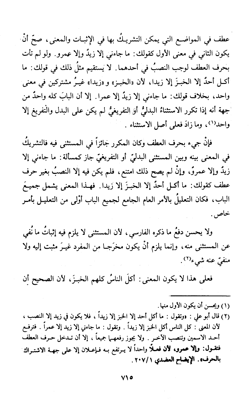 (¬2) قال أبو علي: " وتقول: ما أكل أحد إلا الخبز إلا زيدا، فلا يكون في زيد إلا النصب، لأن المعنى: كل الناس أكل الخبز إلا زيدا. وتقول: ماجاءني إلا زيد إلا عمرا. فترفع أحد الاسمين وتنصب الآخر. ولا يجوز رفعهما جميعا، إلا أن تدخل حرف العطف فتقول: وإلا عمرو، لأن فعلا واحدا لا يرتفع به فإعلان إلا على جهة الاشتراك بالحرف". الإيضاح العضدي1/ 207.