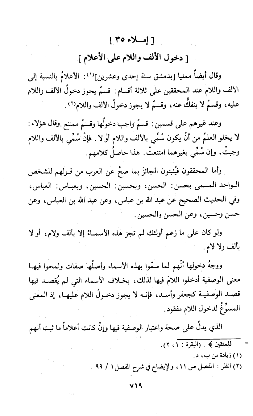 وقال أيضا ممليا [بدمشق سنة إحدى وعشرين] (¬1): الأعلام بالنسبة إلى الألف واللام عند المحققين على ثلاثة أقسام: قسم يجوز دخول الألف واللام عليه، وقسم لا ينفك عنه، وقسم لا يجوز دخول الألف واللام (¬2). وعند غيرهم على قسمين: قسم واجب دخولها وقسم ممتنع. وقال هؤلاء: لا يخلو العلم من أن يكون سمي بالألف واللام أو لا. فإن سمي بالألف واللام وجبت، وإن سمي بغيرهما امتنعت. هذا حاصل كلامهم. وأما المحققون فيثبتون الجائز بما صح عن العرب من قوله للشخص الواحد المسمى بحسن: الحسن، وبحسين: الحسين، وبعباس: العباس، وفي الحديث الصحيح عن عبدالله بن عباس، وعن عبدالله بن العباس، وعن حسن وحسين، وعن الحسن والحسين. ولو كان على ما زعم أولئك لم تجز هذه الأسماء إلا بألف ولام، أو لا بألف ولا لام. ووجه دخولها أنهم لما سموا بهذه الأسماء وصلها صفات ولمحوا فيها معنى الوصفية أدخلوا اللام فيها لذلك، بخلاف الأسماء التي لم يقصد فيها قصد الوصفية كجعفر وأسد، فإنه لا يجوز دخول اللام عليها، إذ المعنى المسوغ لدخول اللام مفقود. الذي يدل على صحة واعتبار الوصفية فيها وإن كانت أعلاما ما ثبت أنهم