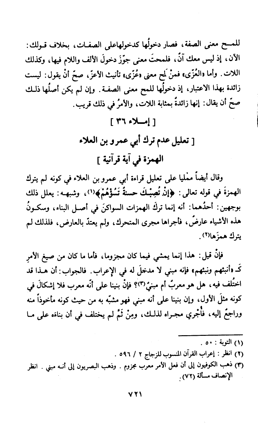 وقال أيضا ممليا على تعليل قراءة أبي عمرو بن العلاء في كونه لم يتزك الهمزة في قوله تعالى: {إن تصبك حسنة تسؤهم} (¬1)، وشبهه: يعلل ذلك بوحهين: أحدهما: أنه إنما ترك الهمزات السواكن في أصل البناء، وسكون هذه الأشياء عارض، فأجراها مجرى المتحرك، ولم يعتد بالعارض، فلذلك لم يترك همزها (¬2). فإن قييل: هذا إنما يمشي فيما كان مجزوما، فأما ما كان من صيغ الأمر كـ " أنبئهم ونبئهم" فإنه مبني لا مدخل له في الإعراب. فالجواب: أن هذا قد اختلف فيه، هل هو معرب أم مبني (¬3)؟ قإن بنينا على أنه معرب فلا إشكال في كونه مثل الأول، وإن بنينا على أنه مبني فهو مشبه به من حيث كونه مأخوذا منه وراجع إليه، فأجري مجراه لذلك، ومن ثم لم يختلف في أن بناءه على ما