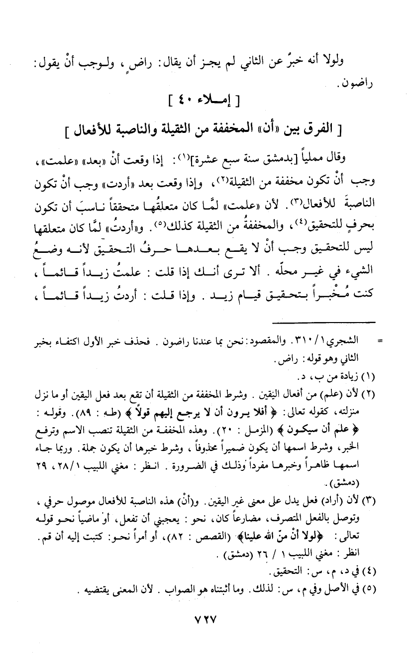(¬2) لأن (علم) من أفعال اليقين. وشرط المخففة من الثقيلة أن تقع بعد فعل اليقين أو ما نزل منزلته، كقوله تعالى: {أفلا يرون لا يرجع إليهم قولا} (طه: 89). وقوله: {علم أن سكون} (المزمل: 20). وهذه المخففة من الثقيلة تنصب الاسم وترفع الخبر، وشرط اسمها أن يكون ضميرا محذوفا، وشرط خبرها أن يكون جملة. وربما جاء اسمها ظاهرا وخبرها مفردا وذلك في الضرورة. انظر: مغني اللبيب 1/ 28، 29 (دمشق).