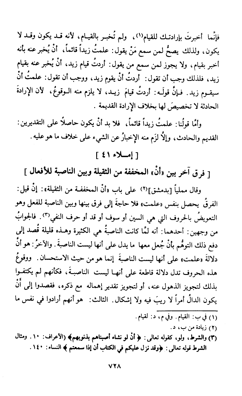 وقال ممليا [بدمشق] (¬2) على باب " أن المخففة من الثقيلة": إن قيل: الفرق يحصل بنفس " علمت" فلا حاجة إلى فرق بينها وبين الناصبة للفعل وهو التعويض بالحروف التي هي السين أو سوف أوقد أو حرف النفي (¬3). فالجواب من وجهين: أحدهما: أنه لما كانت الناصبة هي الكثيرة وهذه قليلة قصد إلى دفع ذلك التوهم بأن جعل معها ما يدل على أنها ليست الناصبة. والآخر: هو أن دلالة " علمت" على أنها ليست الناصبة إنما هو من حيث الا ستحسان. ووقوع هذه الحروف تدل دلالة قاطعة على أنها ليست الناصبة، فكأنهم لم يكتفوا بذلك التجويز الذهول عنه، أو لتجويز تقدير إهماله مع ذكره، فقصدوا إلى أن يكون الدال أمرا لا ريب فيه ولا إشكال. الثالث: هو أنهم أرادوا في نفس ما
