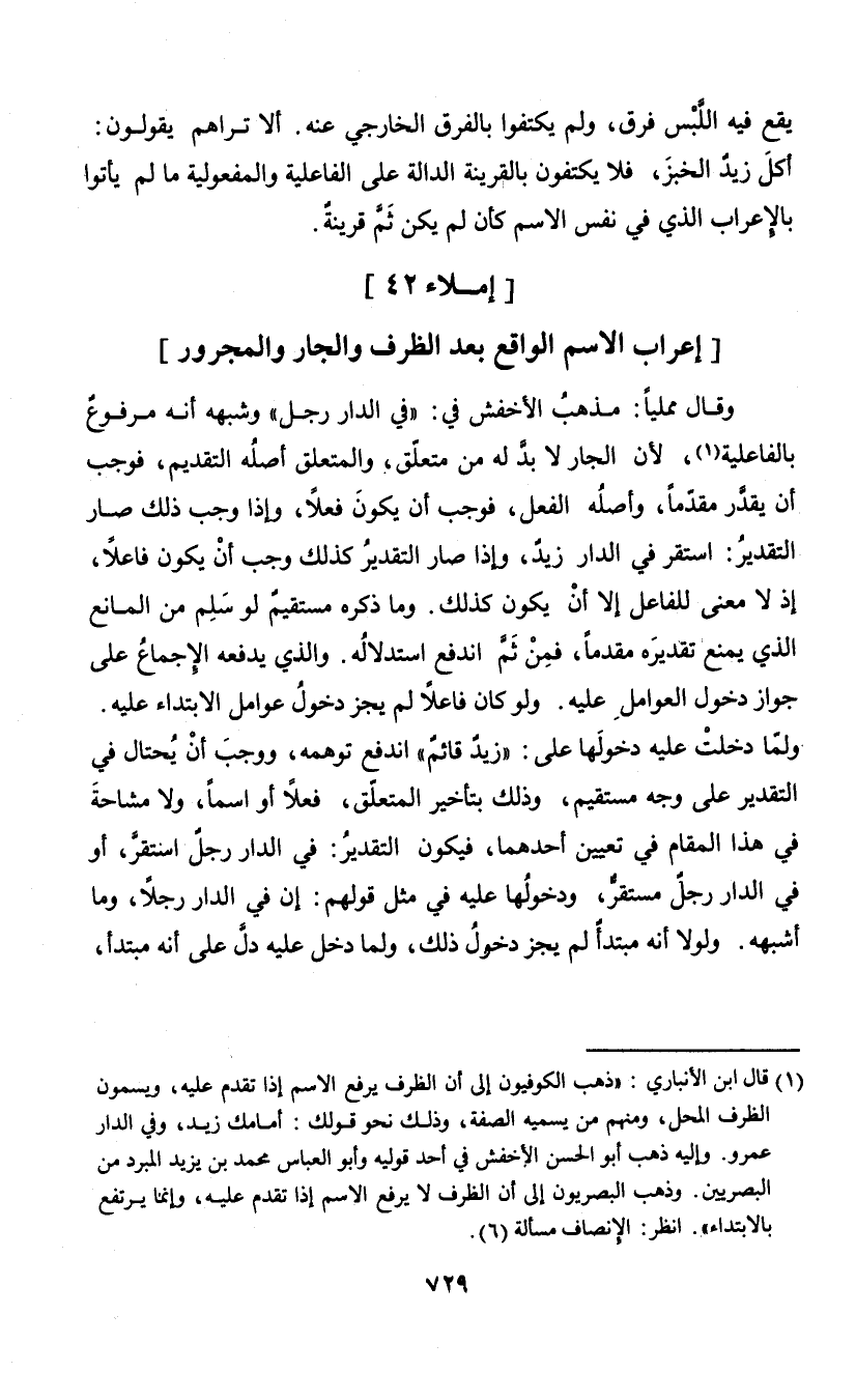 (¬1) قال ابن الأنباري: " ذهب الكوفيون إلى أن الظرف يرفع الاسم إذا تقدم عليه، ويسمون الظرف المحل، ومنهم من يسميه الصفة، وذلك نحو قولك: أمامك زيد، وفي الدار عمرو. وإليه ذهب أبو الحسن الأخفش في أحد قوليه وأبو العباس محمد بن يزيد المبرد من البصريين. وذهب البصريون إلى أن الظرف لا يرفع الاسم إذا تقدم عليه، وإنما يرتفع بالابتداء". انظر: الإنصاف مسألة (6).