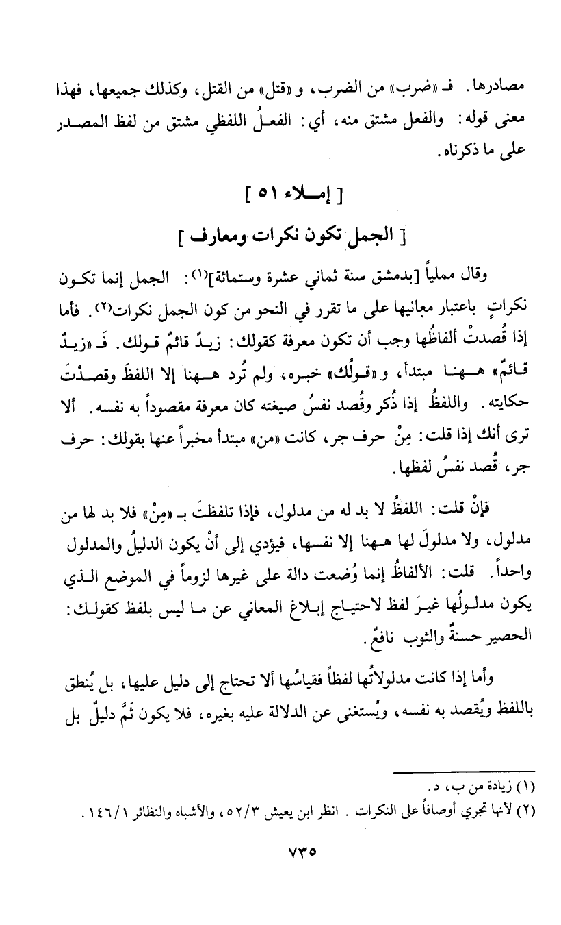 وقال ممليا [بدمشق سنة ثماني عشرة وستمائة] (¬1): الجمل إنما تكون نكرات باعتبار معانهيا على ما تقرر في النحو من كون الجمل نكرات (¬2). فأما إذا قصدت ألفاظها وجب أن تكون معرفة كقولك: زيد قائم قولك. فـ "زيد قائم" ههنا مبتدأ، و"قولك" خبره، ولم ترد ههنا إلا للفط وقصدت حكايته. واللفظ إذا ذكر وقصد نفس صيغته كان معرفة مقصودا به نفسه. ألا ترى أنك إذا قلت: من حرف جر، كانت " من" مبتذأ مخبرا عنها بقولك: حرف جر، قصد نفس لفظها. فإن قلت: اللفظ لا بد له من مدلول، فإذا تلفظت بـ " من" فلا بد لها من مدلول، ولا مدلول لها ههنا إلا نفسها، فيؤدي إلى أن يكون الدليل والمدلول واحدا. قلت: الألفاظ إنما وضعت دالة على عيرها لزوما في الموضع الذي يكون مدلولها غير لفظ لاحتياج إبلاغ المعاني عن ما ليس بلفظ كقولك: الحصير حسنة والثوب نافع. وأما إذا كانت مدلولاتها لفظا فقياسها ألا تحتاج إلى دليل عليها، بل ينطق بللفظ ويقصد به نفسه، ويستغنى عن الدلالة عليه بغيره، فلا يكون ثم دليل بل