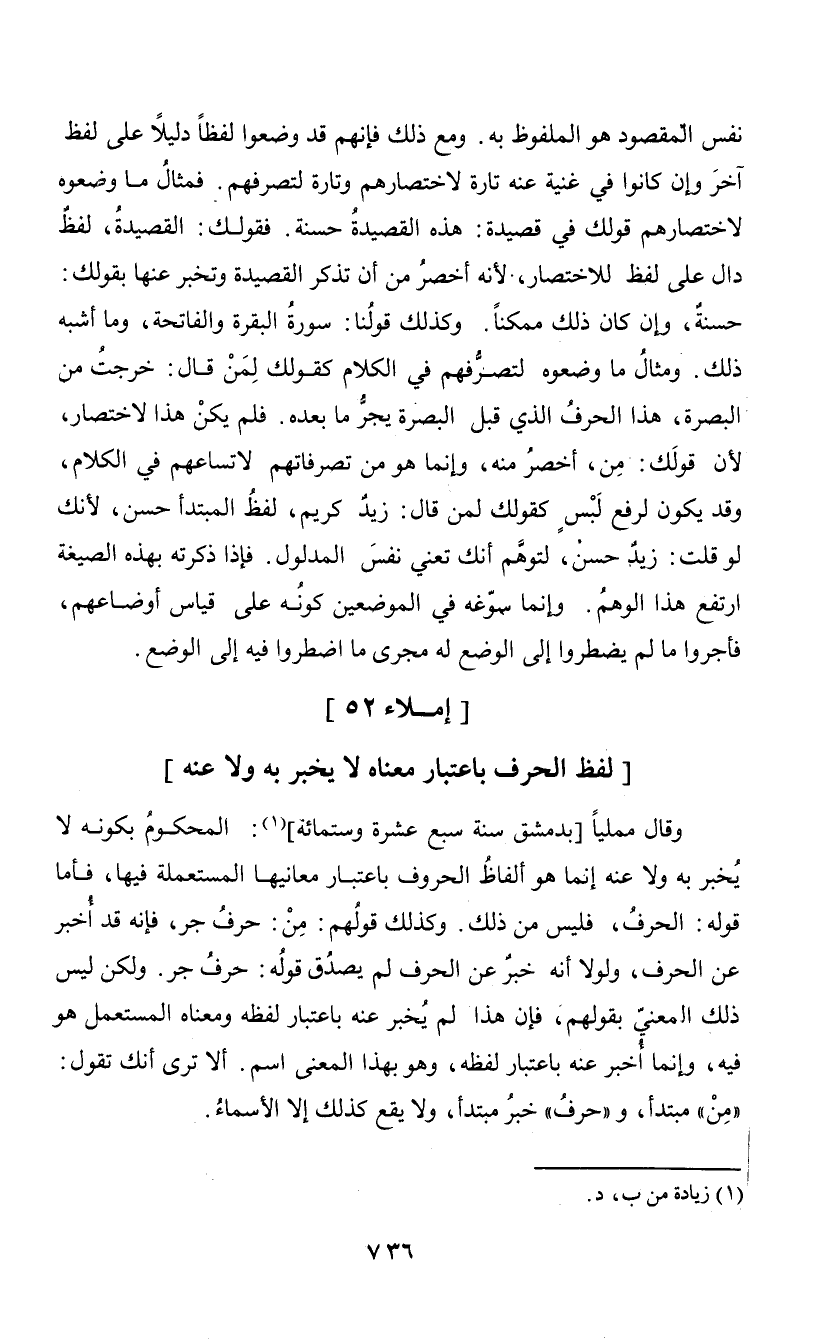 نفس المقصود هو الملفوظ به. ومع ذلك فإنهم قد وضعوا لفظا دليلا على لفظ آخر وإن كانوا في غنية عنه تارة لاختصارهم وتارة لتصرفهم. فمثال ما وضعوه لاختصارهم قولك في قصيدة: هذه القصيدة حسنة. فقولك: القصيدة، لفظ دال على لفظ للاختصار، لأنه أخصر من أن تذكر القصيدة وتخبر عنها بقولك: حسنة، وإن كا ذلك ممكنا. وكذلك قولنا: سورة البقرة والفاتحة، وما أشبه ذلك ومثال ما وضعوه لتصرفهم في الكلام كقولك لمن قال: خرجت من البصرة، هذا الحرف الذي قبل البصرة يجر ما بعده. فلم يكن هذا لاختصار، لأن قولك: من، أخصر منه، وإنما هو من تصرفتهم لاتساعهم في الكلام، وقد يكون لرفع لبس كقولك لمن قال: زيد كريم، لفظ المبتدأ حسن، لأنك لو قلت: زيد حسن، لتوهم أنك تعني نفس المدلول. فإذا ذكرته بهذه الصيغة ارتفع هذا الوهم. وإنما سوغه في الموضعين كونه على قياس أوضاعهم، فأجروا ما لو يضطروا إلى الوضع له مجرى ما اضطروا فيه إلى الوضع.