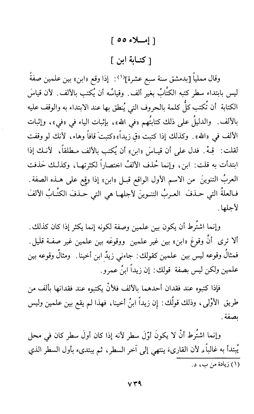 وقال ممليا [بدمشق سنة سبع عشرة] (¬1): إذا وقع "ابن" بين علمين صفة ليس بابتداء سطر كتبه الكتاب بغير ألف. وقياسه أن يكتب بالألف. لأن قياس الكتابة أن تكتب كل كلمة بالحروف التي ينطق بها عند الا بتداء به والوقف عليه بالألف. والدليل على ذلك كتابتهم " في الله"، بأثبات الياء في " في"، وإثبات الألف في " الله". وكذلك إذا كتبت " ق زيدا" " كتبت قافا وهاء، لأنك لو وقفت لقلت: قه. فدل على أن قياس " ابن" أن يكتب بالألف مطلقا، لأنك إذا ابتدأت به قلت: ابن، وإنما حذف الألف اختصارا لكثرتها، وكذلك حذفت العرب التنوين من الاسم الأول الواقع قبل "ابن" إذا وقع على هذه الصفة. فالعلة التي حذف العرب التنوين لأجلها هي التي حذف الكتاب الألف لأجلها. وإنما اشترك أن يكون بين علمين وصفة لكونه إنما يكثر إذا كان كذلك. ألا ترى أن وقوع "ابن" بين غير علمين ووقوعه بين علمين غير صفة قليل. فمثال وقوعه ليس بين علمين كقولك: جاءني زيد ابن أخينا. ومثال وقوعه بين علمين كقولك: جاءني زيد ابن أخينا. ومثال وقوعه بين علمين ولكن ليس بصفة قولك: إن زيدا ابن عمرو. فإذا كتبوه عند فقدان أحدهما بالألف فلأن يكتبوه عند فقدانها بألف من طريق الأولى، وذلك قولك: إن زيدا ابن أخينا، فهذا لم يقع بين علمين وليس بصفة. وإنما اشترط أن لا يكون أول سطر لأنه إذا كان أول سطر كان في محل يبتدأ به غالبا، لأن القارىء ينتهي إلى آخر السطر، ثم يبتدىء بأول السطر الذي