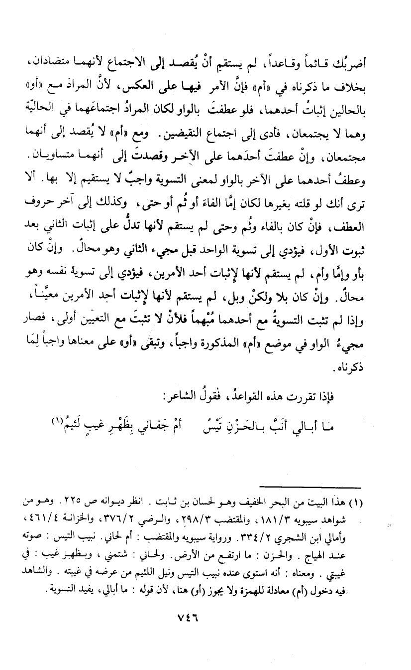 أضربك قائما وقاعدا، لم يستقم أن يقصد إلى الاجتماع لأنهما متضادان، بخلاف ما ذكرناه في " أم" فإن الأمر فيها على العكس، لأن المراد مع "أو" بالحالين إثبات أحدهما، فلو عطفت بالواو لكان المراد اجتماعهما في الحالية وهما لا يجتمان، فأدى إلى اجتماع النقيضين. ومع " أم" لا يقصد إلى أنهما مجتمعان، وإن عطفت أحدهما على الآخر وقصدت إلى أنهما متساويان. وعطف أحدهما على الآخر بالواو لمعنى التسوية واجب لا يستقيم إلا بهما. ألا ترى أنك لو قلته بغيرها لكان إما الفاء أو ثم أو حتى، وكذلك إلى آخر حروف العطف، فإن كان بالفاء وثم وحتى لم يستقم لأنها تدل على إثبات الثاني بعد ثبوت الأول، فيؤدي إلى تسوية الواحد قبل مجيء الثاني وهو محال. وإن كان بأو وإما ,أم، لم يستقم لأنها لآثبات أحد الأمرين، فيؤدي إلى تسويه نفسه وهو محال. وإن كان بلا ولكن وبل، لم يستقم لأنها لإثبات أحد الأمرين معينا، وإذا لم تثبت التسوية مع أحدهما مبهما فلأن لا تثبت مع التعيين أولى، فصار مجيء الواو في موضع " أم" المذكورة واجبا، وتبقى "أو" على معناها واجبا لما ذكرناه. فإذا تقررت هذه القواعد، فقول الشاعر: