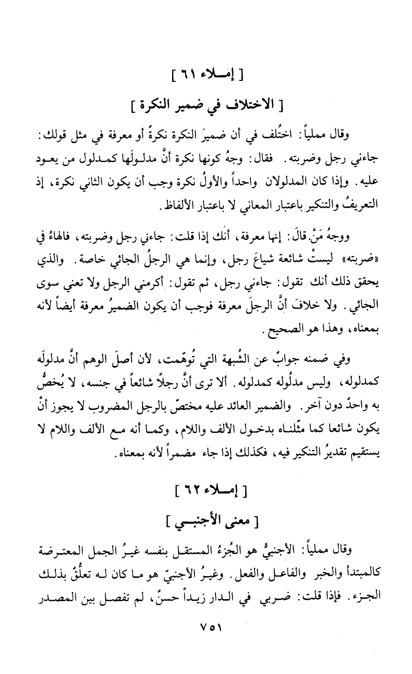وقال ممليا: اختلف في أن ضمير النكرة نكرة أو معرفة في مثل قولك: جاءني رجل وضربته. فقال: وجه كونها نكرة أن مدلولها كمدلول من يعود عليه. وإذا كان المدلولان واحدا والأول نكرة وجب أن يكون الثاني نكرة، إذ التعريف والتنكير باعتبار المعاني لا باعتبار الألفاظ. ووجه من قال: إنها معرفة، أنك إذا قلت: جاءني رجل وضربته، فالهاء في "ضربته" ليست شائعة شياع رجل، وإنما هي الرجل الجائي خاصة. والذي يحقق ذلك أنك تقول: جاءني رجل، ثم تقول: أكرمني الرجل ولا تعني سوى الجائي. ولا خلاف أن الرجل معرفة فوجب أن يكون الضمير معرفة أيضا لأنه بمعناه، وهذا هو الصحيح. وفي ضمنه جواب عن الشبهة التي توهمت، لأن أصل الوهم أن مدلوله كمدلوله، وليس مدلوله كمدلوله. ألا ترى أن رجلا شائعا في جنسه، لا يخص به واحد دون آخر. والضمير العائد عليه مختص بالرجل المضروب لا يجوز أن يكون شائعا كما مثلناه بدخول الألف واللام، كما أنه مع الألف وللام لا يستقيم تقدير التنكير فيه، فكذلك إذل جاء مضمر الأنه بمعناه.