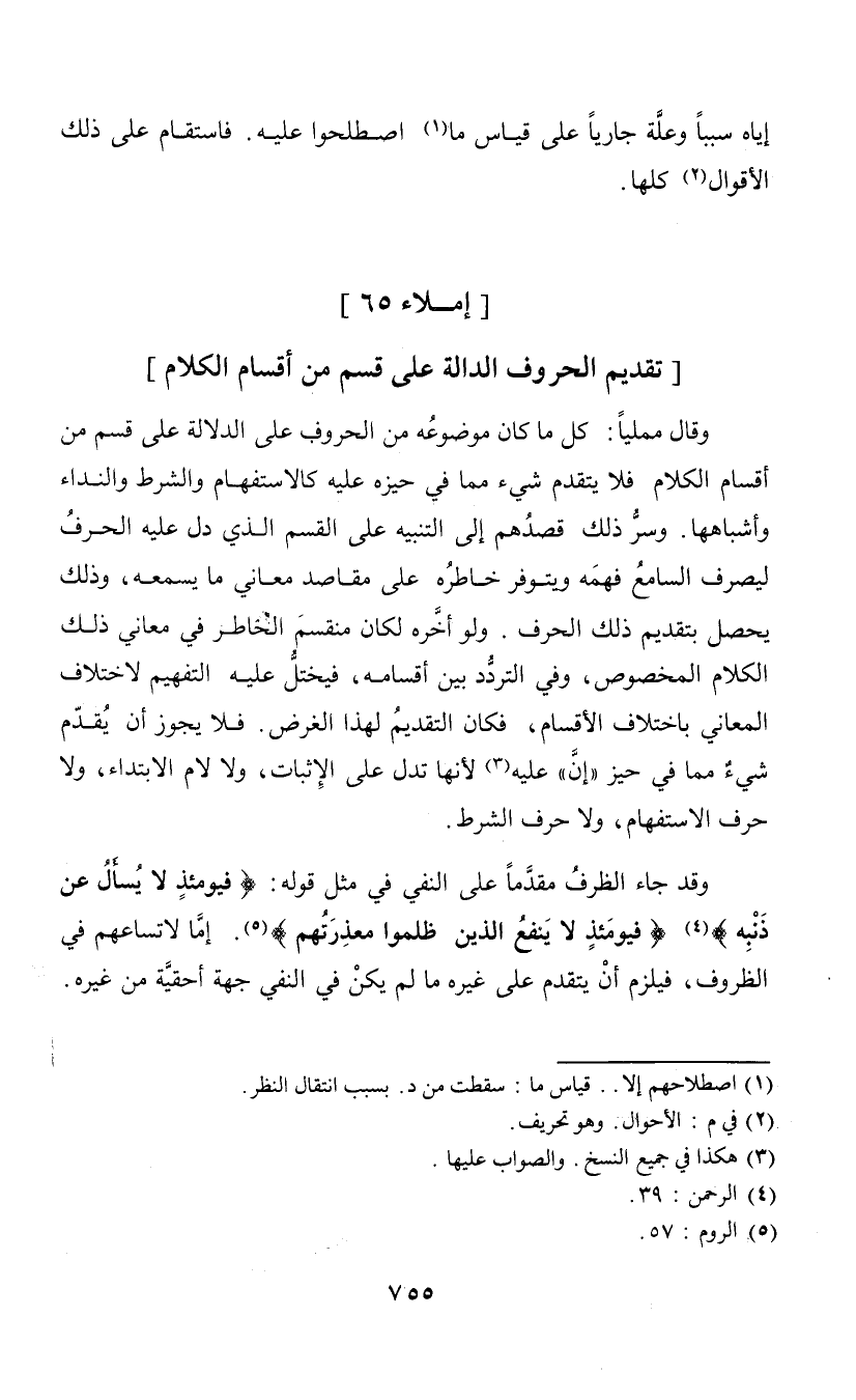 وقال ممليا: كل ما كان موضوعه من الحروف على الدلالة على قسم من أقسام الكلام فلا يتقدم شيء مما في حيزه عليه كالاستفهام والشرط والنداء واشباهها. وسر ذلك قصدهم إلى التنبيه على القسم الذي دل عليه الحرف ليصرف السامع فهمه ويتوفر خاطره على مقاصد معاني ما يسمعه، وذلك يحصل بتقديم ذلك الحرف. ولو أخره لكان منقسم الخاطر في معاني ذلك الكلام المخصوص، وفي التردد بين أقسامه، فيختل عليه التفهيم لا ختلاف المعاني باختلاف الأقسام، فكان التقديم لهذا الغرض. فلا يجوز أن يقدم شيء مما في حيز "إن" عليه (¬3) لأنها تدل على الإثبات، ولا لام الابتداء، ولا حرف الشرط. وقد جاء الظرف مقدما على النفي في مثل قوله: {فيومئذ لا يسأل عن ذنبه} (¬4) {فيومئذ لاينفع الذين ظلموا معذرتهم} (¬5). إما لا تساعهم في الظروف، فيلزم أن يتقدم على غيره ما لم يكن في النفي جهة أحقية من غيره.