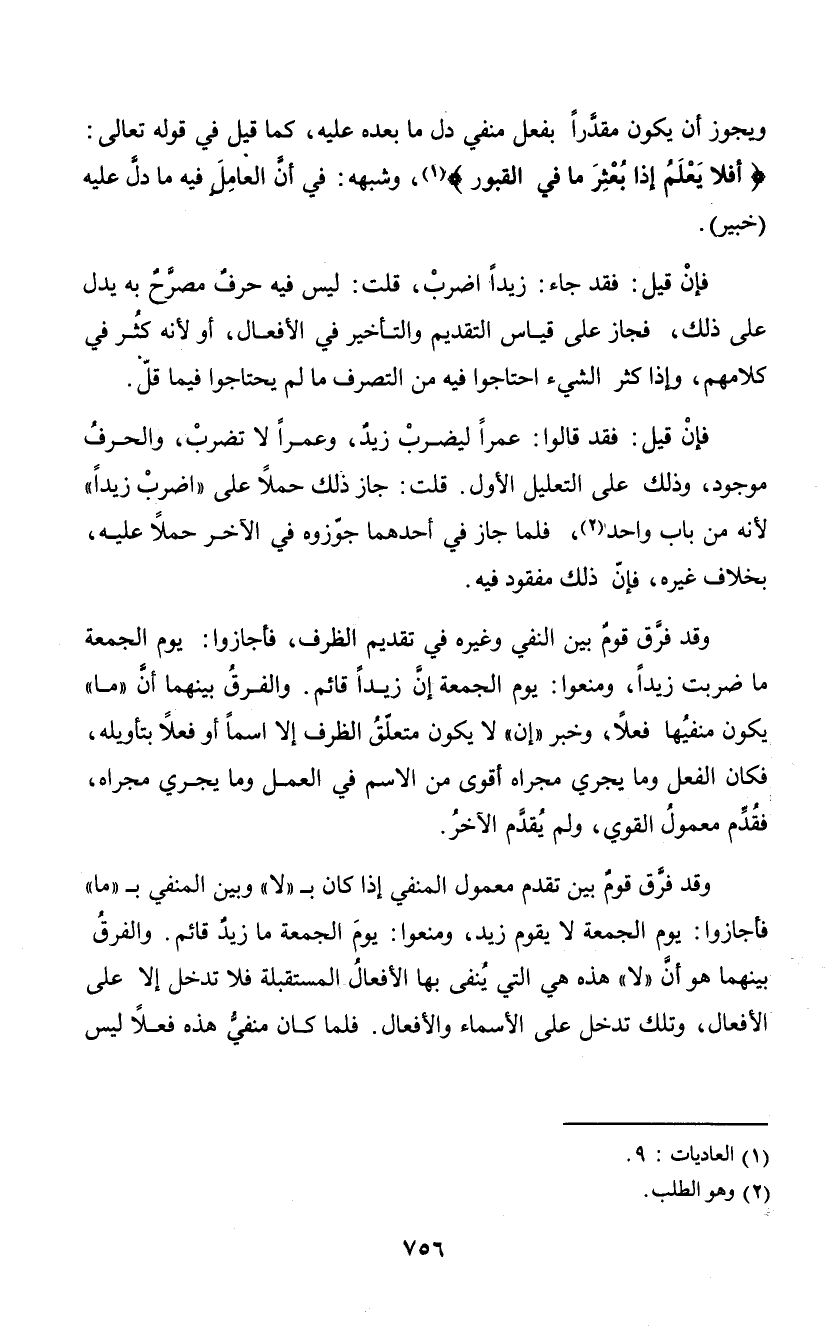 ويجوز أن يكون مقدرا بفعل منفي دل ما بعده عليه، كما قيل في قوله تعالى: {أفلا يعلم إذا بعثر ما في القبور} (¬1)، وشبهه: في أن العامل فيه ما دل عليه (خبير). فإن قيل: فقد جاء: زيدا اضرب، قلت: ليس فيه حرف مصرح به يدل على ذلك، فجاز على قياس التقديم والتأخير في الأفعال، أو لأنه كثر في كلامهم، وإذا كثر الشيء احتاجوا فيه من التصرف ما لم يحتاجوا فيما قل. فإن قيل: فقد قالوا: عمرا ليضرب زيد، وعمرا لا تضرب، والحرف موجود، وذلك على التعليل الأول. قلت: جاز ذلك حملا على "اضرب زيدا" لأنه من باب واحد (¬2)، فلما جاز في أحدهما جوزوه في الآخر حملا عليه، بخلاف غيره، فإن ذلك مفقود فيه. وقد فرق قوم بين النفي وغيره في تقديم الظرف، فأجازوا: يوم الجمعة ما ضربت زيدا، ومنعوا: يوم الجمعة إن زيدا قائم. والفرق بينهما أن "ما" يكون منفيها فعلا، وخبر "إن" لا يكون متعلق الظرف إلا اسما أو فعلا بتأويله، فكان الفعل وما يجري مجراه أقوى من الاسم في العمل وما يجري مجراه، فقدم معمول القوي، ولم يقدم الآخر. وقد فرق قوم بين تقدم معمول المنفي إذل كان بـ "لا" وبين المنفي بـ "ما" فأجازوا: يوم الجمعة لا يقوم زيد، ومنعوا: يوم الجمعة ما زيد قائم. والفرق بينهما هو أن "لا" هذه هي التي ينفى بها الأفعال المستقبلة فلا تدخل إلا على الأفعال، وتلك تدخل على الأسماء والأفعال المستقبلة فلا تدخل إلا على الأفعال، وتلك تدخل على الأسماء والأفعال. فلما كان منفي هذه فعلا ليس