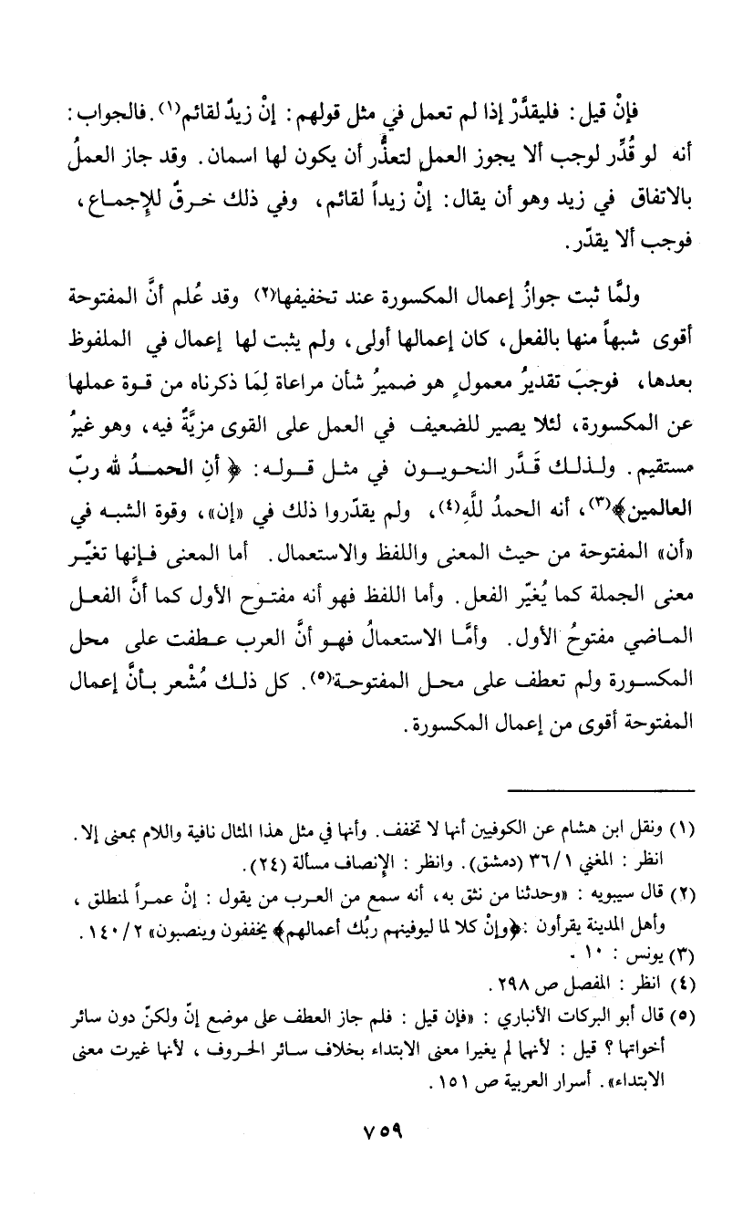 فإن قيل: فليقدر إذل لم تعمل في مثل قولهم: إن زيد لقائم (¬1). فالجواب: إنه لو قدر لوجب ألا يجوز العمل لتعذر أن يكون لها اسمان. وقد جاز العمل بالاتفاق في زيد وهو أن يقال: إن زيدا لقائم، وفي ذلك خرق للإجماع، فوجب ألا يقدر. ولما ثبت جواز إعمال المكسورة عند تخفيفها (¬2) وقد علم أن المفتوحة أقوى شبها منها بالفعل، كان إعمالها أولى، ولم يثبت لها إعمال في الملفوظ بعدها، فوجب تقدير معمول هو ضمير شأن مراعاة لما ذكرناه من قوة عملها عن المكسورة، لئلا يصير للضعيف في العمل على القوى مزية فيه، وهو غير مستقيم. ولذلك قدر النحويون في مثل قوله: {أن الحمد لله رب العالمين} (¬3)، أنه الحمد لله (¬4)، ولم يقدروا ذلك في "إن"، وقوة الشبه في "أن" المفتوحة من حيث المعنى واللفظ والاستعمال. أما المعنى فإنها تغير معنى الجملة كما يغير الفعل. وأما اللفظ فهو أنه مفتوح الأول كما أن الفعل الماضي مفتوح الأول. وأما الاستعمال فهو أن العرب عطفت على محل المكسورة ولم تعطف على محل المفتوحة (¬5). كل ذلك مشعر بأن إعمال المفتوحة أقوى من إعمال المكسورة.