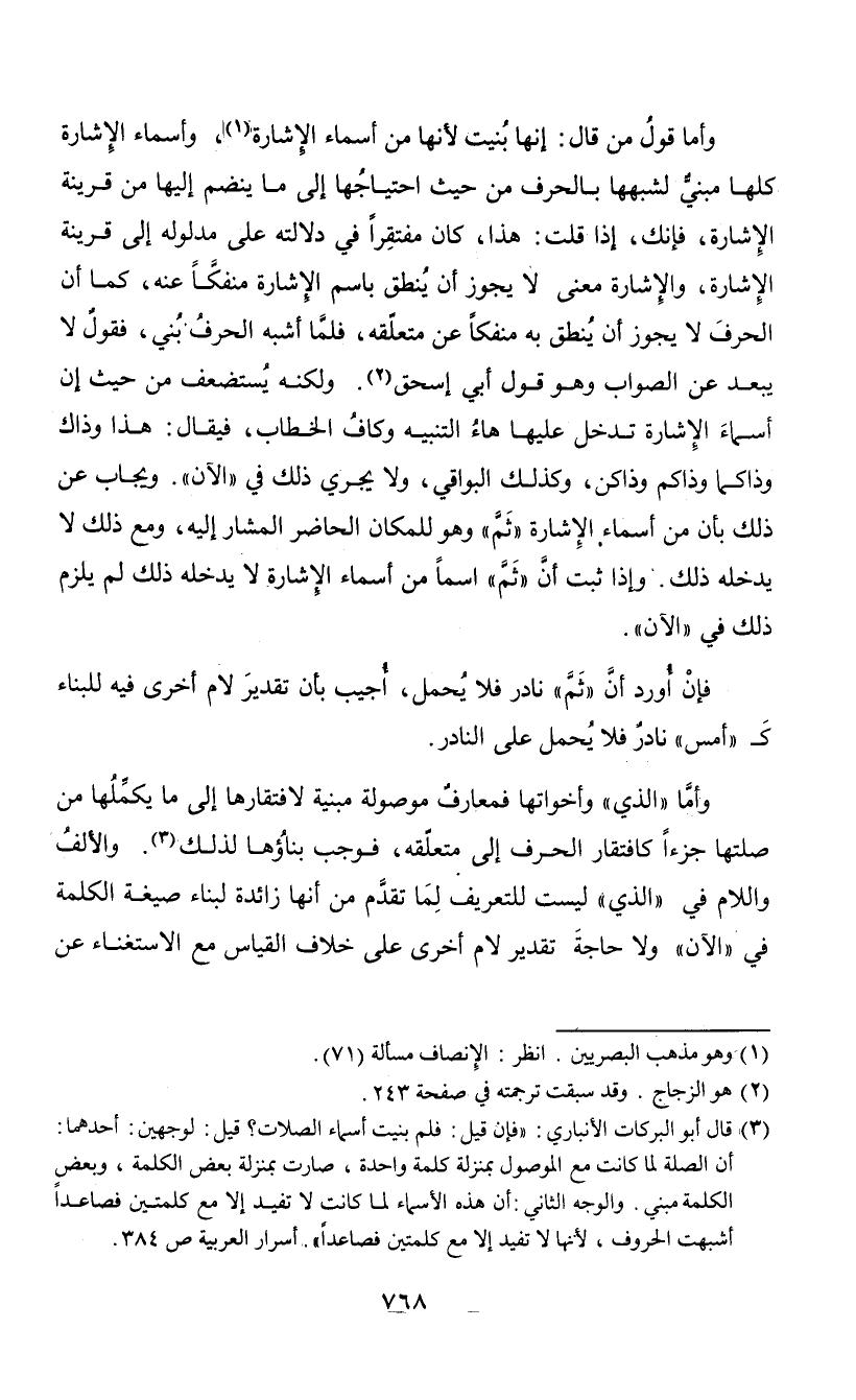 (¬3) قال أبو البركات الأنباري: "فإن قيل: فلم بنيت أسماء الصلات؟ قيل: لوجهين: أحدهما: أن الصلة لما كانت مع الموصول بمنزلة كلمة واحدة، صارت بمنزلة بعض الكلمة، وبعض الكلمة مبني. والوجه والوحه الثاني: أن هذه الأسماء لما كانت لا تفيد إلا مع كلمتين فصاعدا أشبهت الحروف، لأنها لا تفيد إلا مع كلمتين فصاعدا". أسرار العربية ص 384.