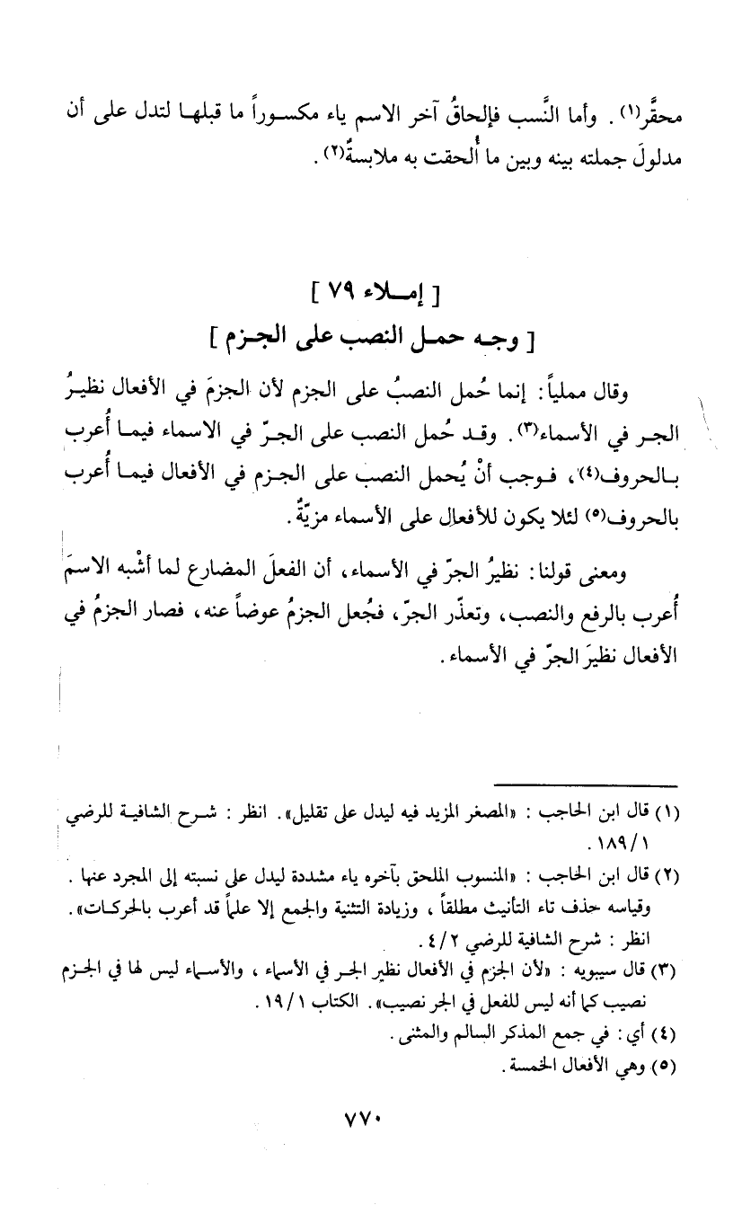 (¬3) قال سيبويه: "لأن الجزم في الأفعال نظير الجر في الأسماء، والأسماء ليس لها في الجزم يصيب كما أنه ليس للفعل في الجر نصيب". الكتاب 1/ 19.