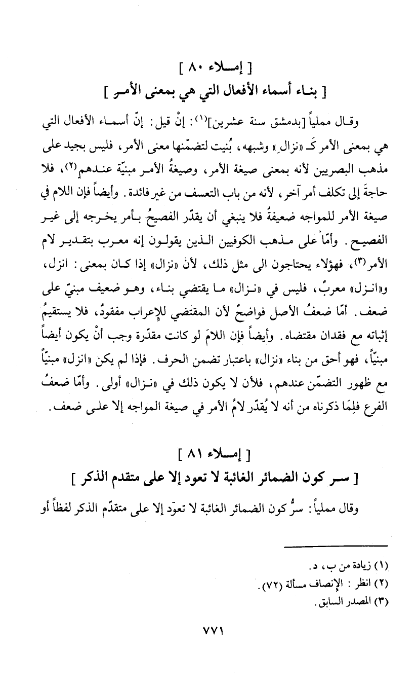 وقال ممليا [بدمشق سنة عشرين] (¬1): إن قيل: إن أسماء الأفعال التي هي بمعنى الأمر كـ "نزال" وشبهه، بنيت لتضمنها معنى الأمر، فليس بجيد على مذهب البصريين لأنه بمعنى صيغة الأمر، وصيغة الأمر مبنية عندهم (¬2)، فلا حاجة إلى تكلف أمر آخر، لأنه من باب التعسف من غير فائدة. وأيضا فإن اللام في صيغة الأمر للمواجه ضعيفة فلا ينبغي أن يقدر الفصيح بأمر يخرجه إلى غير الفصيح. وأما على مذهب الكوفيين الذين يقولون إنه معرب بتقدير لام الأمر (¬3)، فهؤلاء يحتاجون الى مثل ذلك، لأن "نزال" إذل كان بمعنى: انزل، و"انزل" معرب، فليس في "نزال" ما يقتضي بناء، وهو ضعيف مبني على صعف الأصل فواضح لأن المقتضي للإعراب مفقود، فلا يستقيم إثباته مع فقدان مقتضاه. وايضا فإن اللام لو كانت مقدرة وجب أن يكون أيضا مبنيا، فهو أحق من بناء "نزال" باعتبار تضمن الحرف. فإذا لم يكن "انزال" مبنيا مع ظهور التضمن عندهم. فلأن لا يكون ذلك في "نزال" أولى. وأما ضعف الفرع فلما ذكرناه من أنه لا يقدر لام الأمر في صيغة المواجه إلا على ضعف