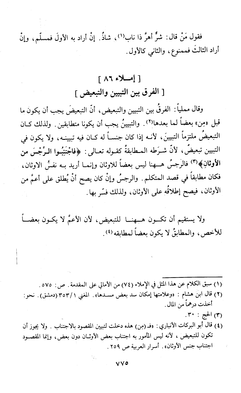 (¬4) قال أبو البركات الأنباري: "فـ (من) هذه دخلت لتبيين المقصود بالاجتناب. ولا يجوز أن تكون للتبعيض، لأنه ليس المأمور به اجتناب بعض الأوثان دون بعض، وإنما المقصود اجتناب جنس الأوثان". أسرار العربية ص 259.