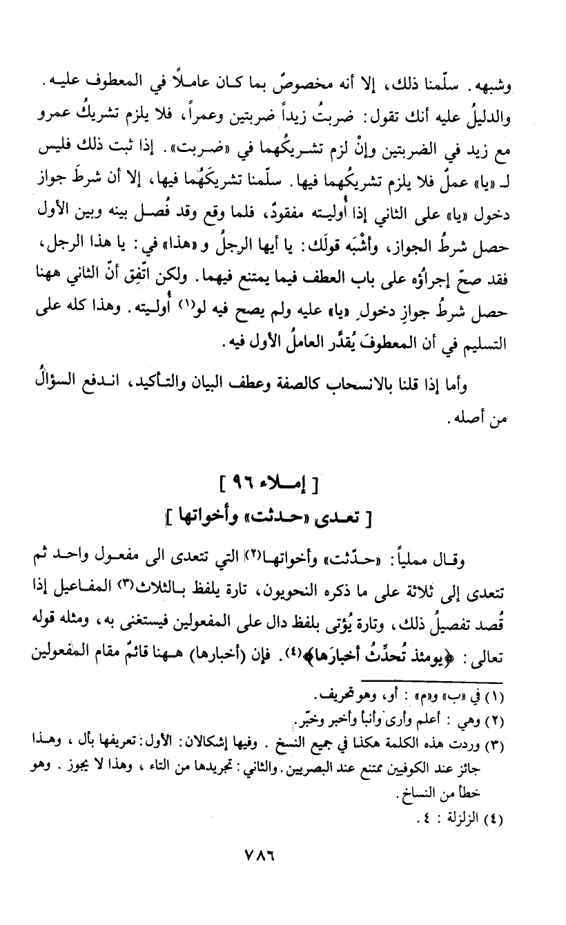 وقال ممليا: "حدثت" وأخواتها (¬2) التي تتعدى إلى مفعول واحد ثم تتعدى إلى ثلاثة على ما ذكره النحويون، تارة يلفظ بالثلاث (¬3) المفاعيل إذا قصد تفصيل ذلك، وتارة يؤتى بلفظ دال على المفعولين فيستغنى به، ومثله قوله تعالى: {يومئذ تحدث أخبارها} (¬4). فأن (أخبارها) ههنا قائم مقام المفعولين