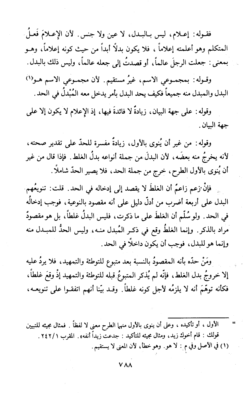 فقوله: إعلام، ليس بالبدل، لا غين ولا جنس. لأن الإعلام فعل المتكلم وهو أعلمته إعلاما، فلا يكون بدلا أبدا من حيث كونه إعلاما، وهو بمعنى: جعلت الرجل عالما، أو قصدت إلى جعله عالما، وليس ذلك بالبدل. وقوله: بمجموعي الاسم، غير مستقيم. لأن مجموعي الاسم هو (¬1) البدل والمبدل منه جميا فيكف يحد البدل بأمر يدخل معه المبدل في الحد. وقوله: على جهة البيان، زيادة لا فائدة فيها، إذ الإعلام لا يكون إلا على جهة البيان. وقوله: من غير أن ينوى بالأول، زيادة مفسرة للحد على تقدير صحته، لأنه يخرج منه بضه، لأن البدل من جملة أنواعه بدل الغلط. فإذا قال من غير أن ينوى بالأول الطرح، خرج من جملة الحد، فلا يصير الحد شاملا فإن زعم زاعم أن الغلظ لا يقصد إلى إدخاله في الحد. قلت: تنويعهم البدل على أربعة أضرب من أدل دليل على أنه مقصود بالنوعية، فوجب إدخاله في الحد. ولو سلم أن الغلط على ما ذكرت، فليس البدل غلطا، بل هو مقصود مراد بالذكر. وإنما الغلط وقع في ذكر المبدل منه، وليس الحد للمبدل منه وإنما هو للبدل، فوجب أن يكون داخلا في الحد. ومن حده بأنه المقصود بالنسبة بعد متبوع للتوطئة والتمهيد، فلا يرد عليه إلا خروج بدل الغلط، فإنه لم يذكر المتبوع قبله للتوطئة والتمهيد إذ وقع غلطا، فكأنه توهم أنه لا يلزمه لأجل كونه غلطا. وقد بينا أنهم اتفقوا على تنويعه،
