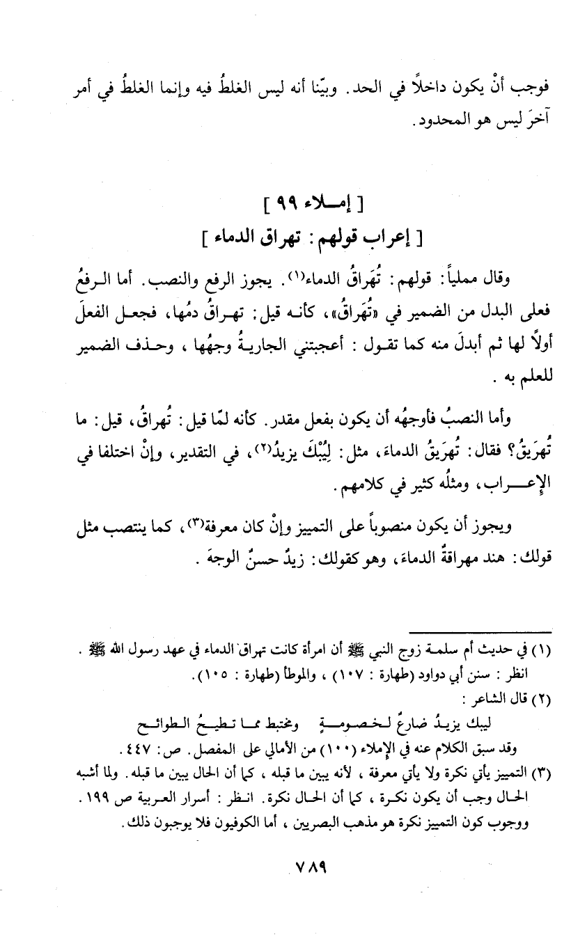 وقال ممليا: قولهم: تهراق الدماء (¬1). يجوز الرفع والنصب. أما الرفع فعلى من الضمير في "تهراق"، كأنه قيل: تهراق دمها، فجعل الفعل أولا لها ثم أبدل منه كما تقول: أعجبتني الجارية وجهها، وحذف الضمير للعلم به. وأما النصب فاوجهه أن يكون بفعل مقدر. كأنه لما قيل: تهراق، قيل: ما تهريق؟ فقال: تهريق الدماء، مثل: ليبك يزيد (¬2)، في التقدير، وإن اختلفا في الإعراب، ومثله كثير في كلامهم. ويجوز أن يكون منصوبا على التمييز وإن كان معرفة (¬3)، كما ينتصب مثل قولك: هند مهراقة الدماء، وهو كقولك: زيد حسن الوجه.