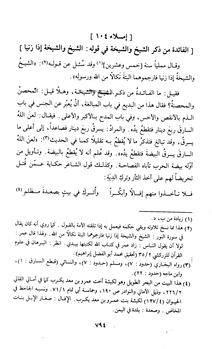 وقال ممليا سنة [خمس وعشروين] (¬1) وقد سئل عن قوله (¬2): "الشيخ والشيخة إذا زنيا فار جموهما البتة نكالا من الله ورسوله". فقيل: ما القائدة من ذكر الشيخ والشيخة، وهلا قيل: المحصن والمحصنة؟ فقال هذا من البديع في باب المبالغة، أن يعبر عن الجنس في باب الذم بالأنقص والأخس، وفي باب المدح بالكبر والأعلى. فيقال: لعن الله السارق ربع دينار فتقطع يده. والمراد: يسرق رب دينا فصاعدا، إلى أعلى ما يسرق، وقد تبالغ فتذكر ما لا يقطع به تقليلا كما في الحديث (¬3): "لعن الله السارق يسرق البيضة فتقطع يده". وقد علم أنه لا يقطع بالبيضة. وتأويل من اوله بيضة الحرب تأباه الفصاحة. وكذلك قول الشاعر حكاية عمن قتل تحريضا لهم على أخذ الثأر وترك الدية: