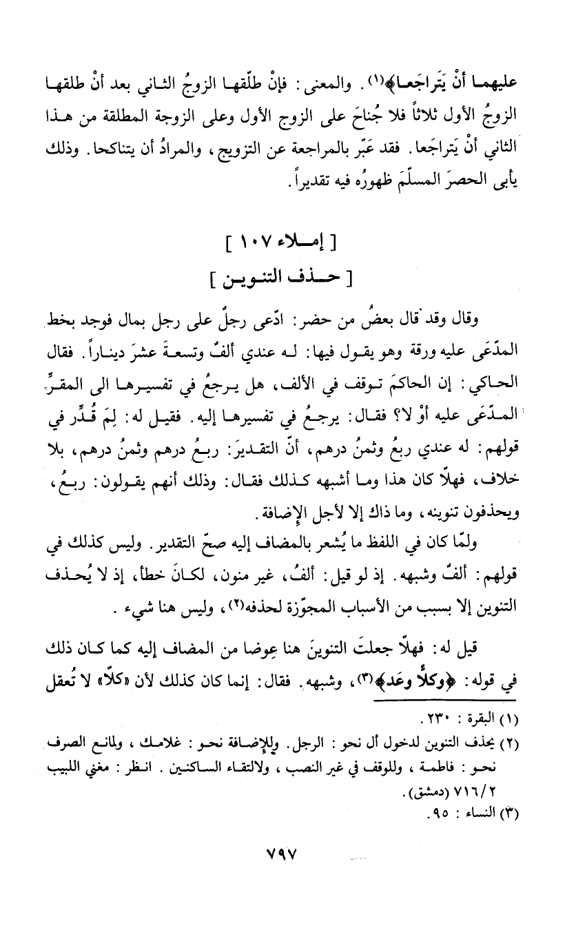 (¬2) يحذف التنوين لدخول أل نحو: الرجل. وللإضافة نحو: غلامك، ولمانع الصرف نحو: فاطمة، وللوقف في غير النصب، ولالتقاء الساكنين. انظر: معني اللبيب 2/ 716 (دمشق).