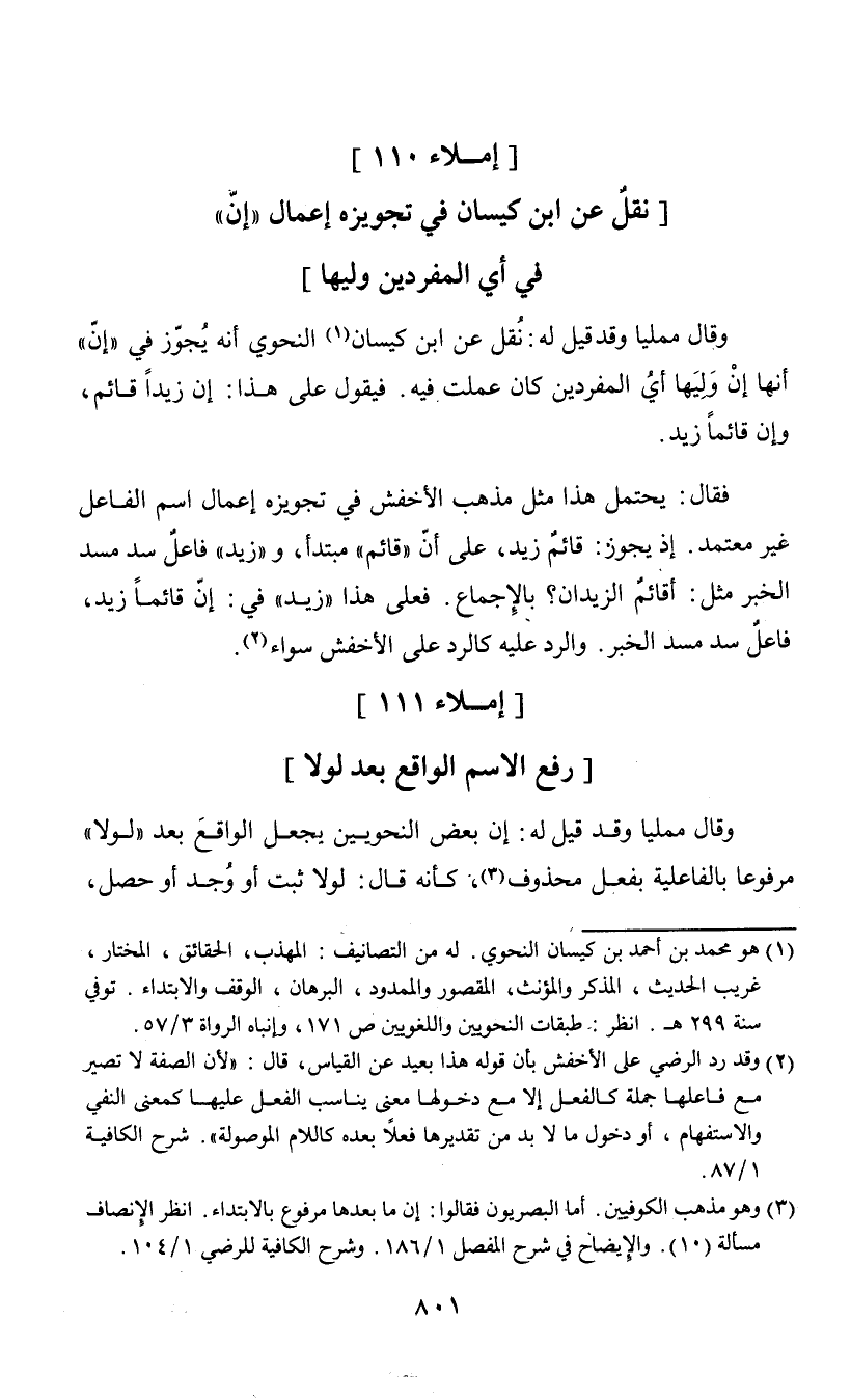 وقال ممليا وقد قيل له: نقل عن ابن كيسان (¬1) النحوي أنه يجوز في "إن" أنها إن وليها أي المفردين كان عملت فيه. فيقول على هذا: إن زيدا قائم، وإن قائما زيد. فقال: يحتمل هذا مثل مذهب الأخفش في تجويزه إعمال اسم الفاعل غير معتمد. إذ يجوز: قائم زيد، على أن "قائم" مبتدأ، و"زيد" فاعل سد مسد الخبر مثل: أقائم الزيدان؟ بالإجماع. فعلى هذا "زيد" في: إن قائما زيد، فاعل سد مسد الخبر. والرد عليه كالرد على الأخفش سواء (¬2).