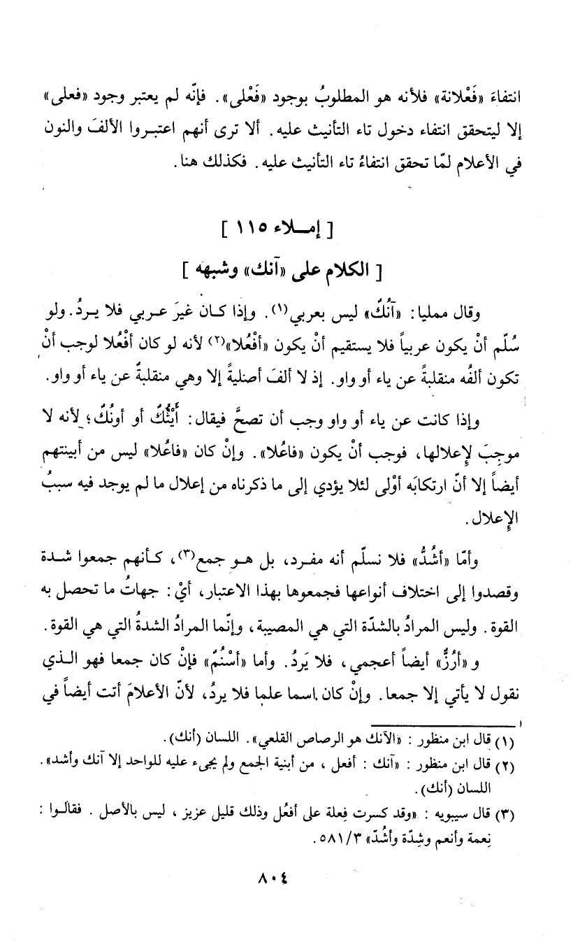 وقال ممليا: "آنك" ليس بعربي (¬1). وإذا كان غير عربي فلا يرد. ولو سلم أن يكون عربيا فلا يستقيم أن يكون "أفعلا" (¬2) لأنه لو كان أفعلا لوجب أن تكون ألفه منقلبة ن ياء أو واو. إذ لا ألف أصلية إلا وهي منقلبة عن ياء أو واو. وإذ كانت عن ياء أو واو وجب أن تصح فيقال: أيثك أو أونك؛ لأنه لا موجب لإ علالها، فوجب أن يكون "فاعلا". وإن كان "فاعلا" ليس من أبينتهم أيضا إلا أن ارتكابه أولى لئلا يؤدي إلى ما ذكرنه من إعلال ما لم يوجد فيه سبب الإعلال. وأما "أشد" فلا نسلم أنه مفرد، بل هو جمع (¬3)، كانهم جمعوا شدة وقصدوا إلى اختلاف أنواعها فجموها بهذا الاعتبار، أي: جهات ماتحصل به القوة. وليس المراد بالشدة التي هي المصيبة، وإنما المراد الشدة التي هي القوة. و"أرز" أيضا أعجمي، فلا يرد. وأما "أسنم" فإن كان جمعا فهو الذي نقول لا يأتي إلا جمعا. وإن كان اسما علما فلا يرد، لأن الأعلام أتت أيضا في