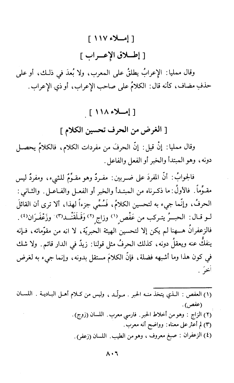 وقال ممليا: إن قيل: إن الحرف من مفردات الكلام، فالكلا م يحصل دونه، وهو المبتدأوالخبر أو الفعل والفاعل. فالجواب: أن المفرد على ضربين: مفرد وهو مقوم للشيء، ومفرد ليس مقوما. فالأول: ما ذكرناه من المبتدأ والخبر أو الفعل والفاعل. والثاني: الحرف، وإنما جيء به لتحسين الكلام، فسمي جزءا لهذا، ألا ترى أن القائل لو قال: الحبر يتركب من عفص (¬1) وزاج (¬2) وقلقند (¬3) وزعفران (¬4) فالزعفران ههنا لم يكن إلا لتحسين الهيئة الحبرية، لا انه من مقوماته، فإنه ينفك عنه ويعقل دونه، كذلك الحرف مثل قولنا: زيد في الدار قائم. ولا شك في كون هذا وما أشبهه فضلة، فإن الكلام مستقل بدونه، وإنما جيء به لغرض آخر.