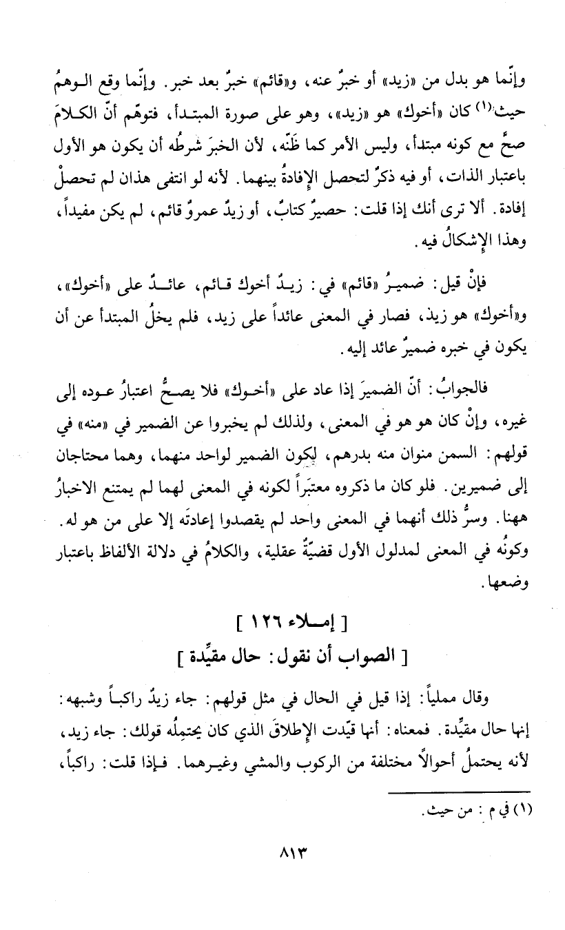 وقال ممليا: إذا قيل قي الحال في مثل قولهم: جاء زيد راكبا وشبهه: إنها حال مقيدة. فمعناه: أنها قيدت الإطلاق الذي كان يحتمله قولك: جاء زيد، لأنه يحتمل أحوالا مختلفة من الركوب والمشي وغيرهما. فإذا قلت: راكبا،