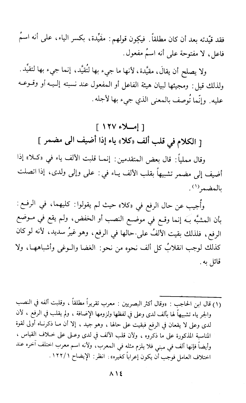 وقال ممليا: قال بعض المتقدمين: إنما قلبت الألف ياء في "كلا" إذا أضيف إلى مضمر تشبيها بقلب الألف ياء في: على وإلى ولدى، إذا اتصلت بالمضمر (¬1). وأجيب عن حال الرفع في "كلا" حيث لم يقولوا: كليهما، في الرفع: بأن المشبه به إنما وقع في موضع النصب أو الخفض، ولم يقع في موضع الرفع، فلذلك بقيت الألف على حالها في الرفع، وهو غير سديد، لأنه لو كان كذلك لوجب انقلاب كل ألف نحوه من نحو: الغضا والوغى واشباهها، ولا قائل به.